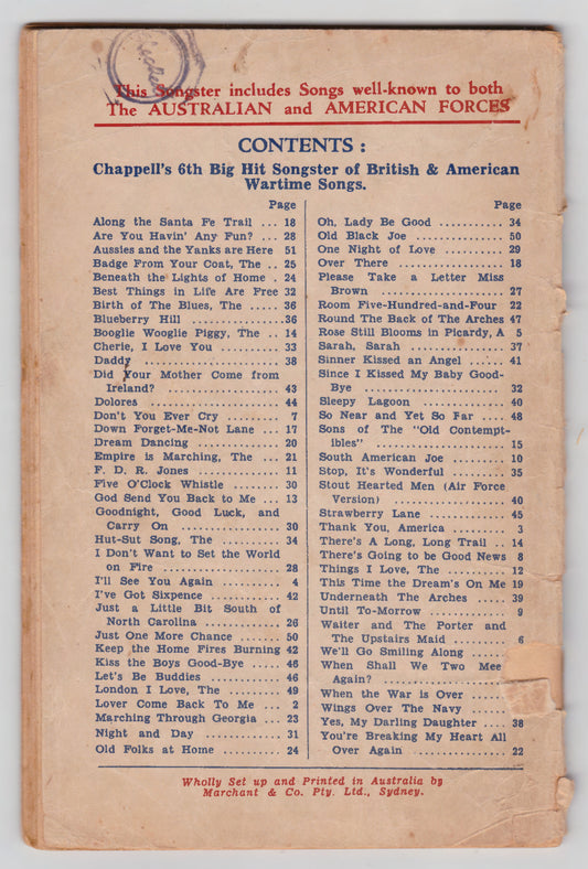 Chappell's Big Hit Songster 6th - British & American Wartime Songs