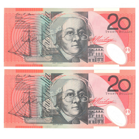Australian 2008 20 Dollar Stevens Henry Polymer Banknote Pair s/n DD 08456678 & 9 - Uncirculated