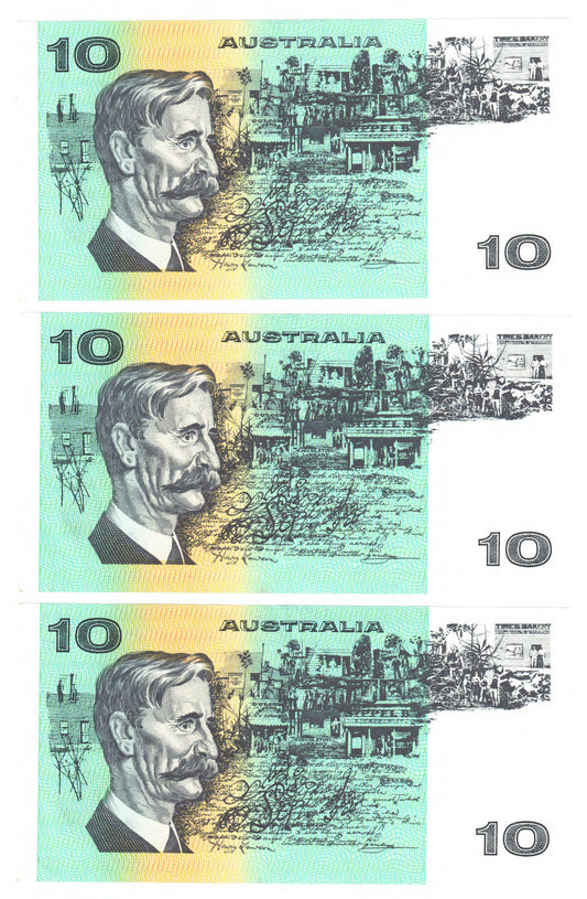 Australian 1985 10 Dollar Johnston Fraser Banknote Run Of 3 s/n UKU 208945 -47 - Uncirculated