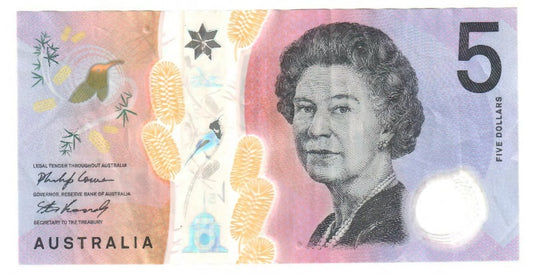 Australian 2019 5 Dollar Lowe Kennedy Polymer Note s/n BC 190070334 - Circulated
