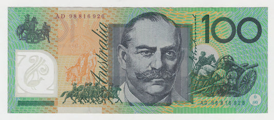 Australian 1998 100 Dollar Evans MacFarlane Polymer Banknote s/n AD 98816926 - Circulated