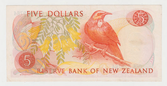 New Zealand 5 Dollar Wilks Banknote 1968 - 1975 Early Note Good Grade s/n 066 529764