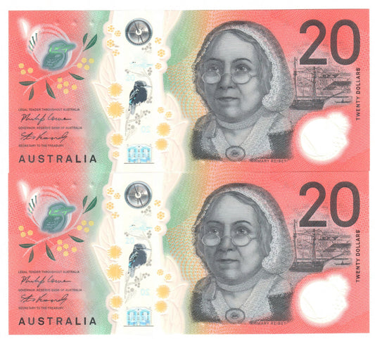 Australian 2020 20 Dollar Lowe Kennedy Polymer Banknote Pair s/n DG200813113 & 4