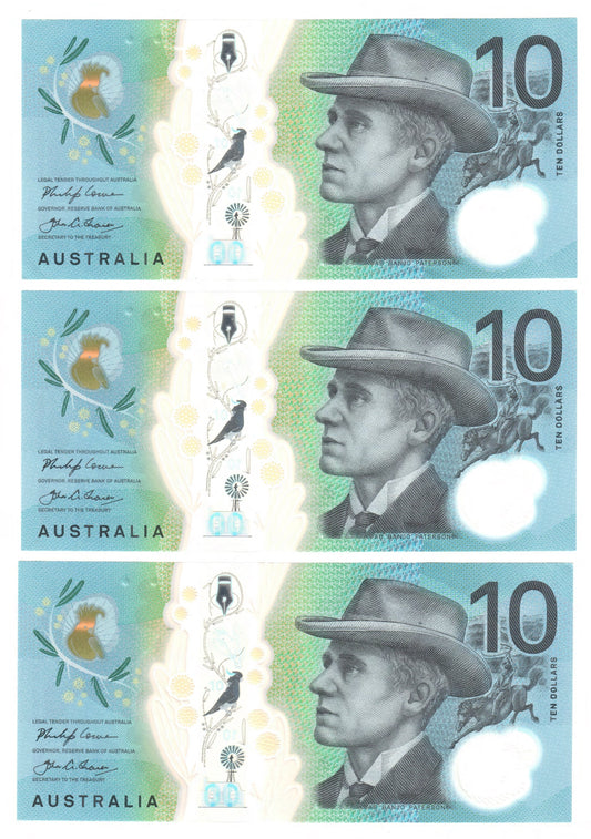 Australian 2017 10 Dollar Lowe Fraser Polymer Banknote Run Of 3 s/n CD 171314048-4050 - Circulated