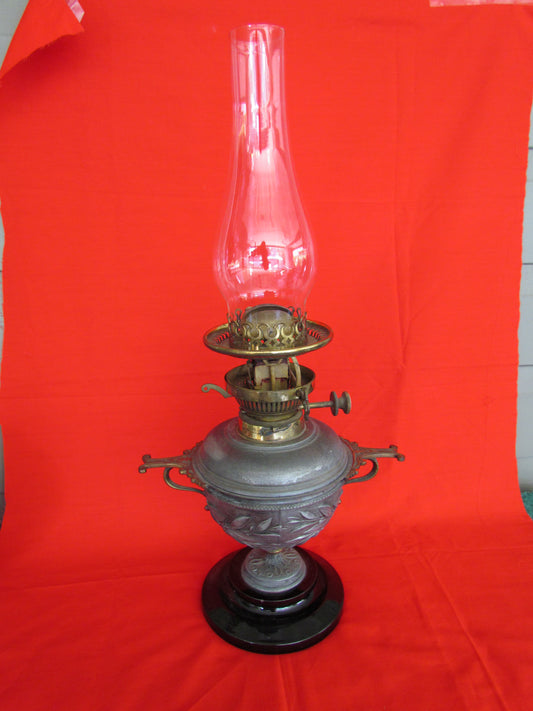 Victorian Pewter & Brass Duplex Burner Oil Lamp with Red Glass Shade