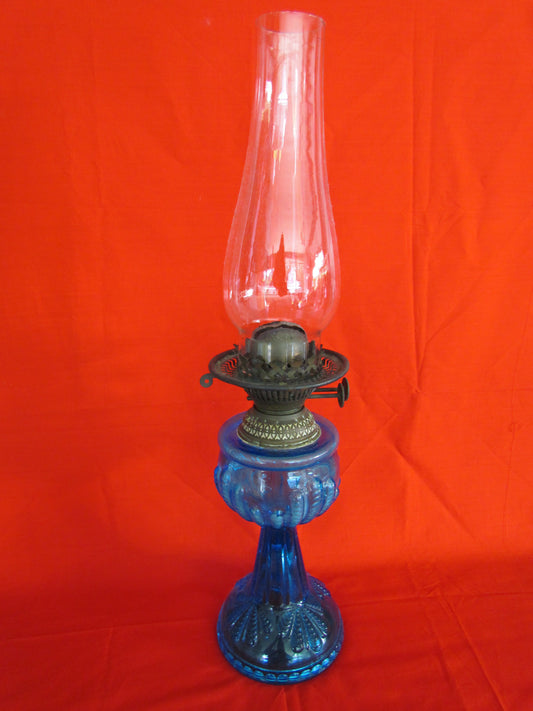 Victorian Blue Glass Duplex Burner Oil Lamp With Clear Glass Etched Shade