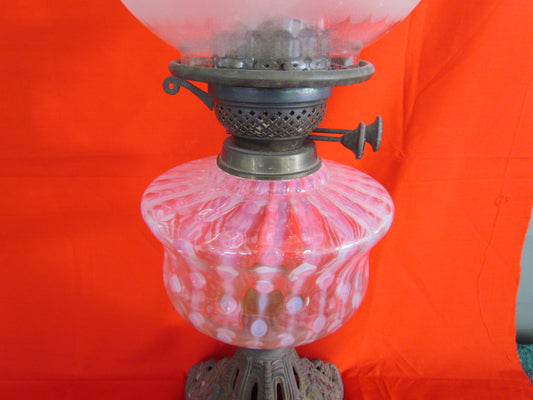 Victorian Cast Iron Duplex Burner Oil Lamp With Pink Vaseline Font And Clear Etched Glass Shade