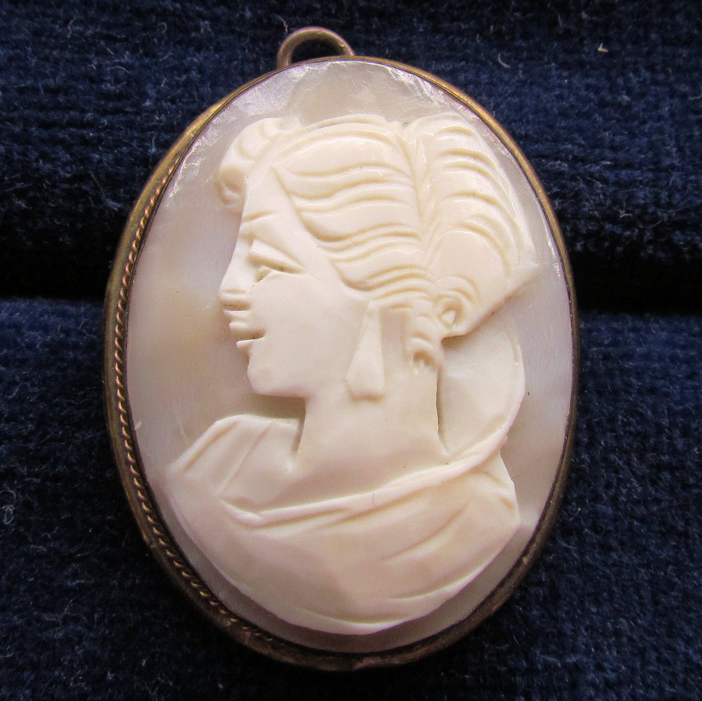 10ct Lined Gilt Cameo Pendant Brooch. Finish is worn sold 'As Is'. Please view images as all images are of the actual item.