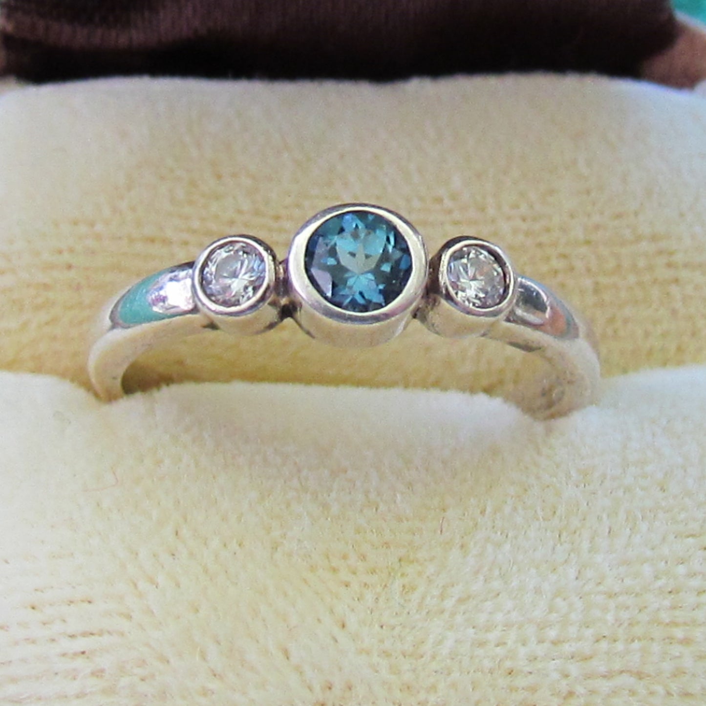 925 Sterling Silver Bezel Set Blue Topaz Dress Ring With 1 Clear Stone Either Side. Bezel set topaz and clear stone dressing ring with a rolled edge shank.