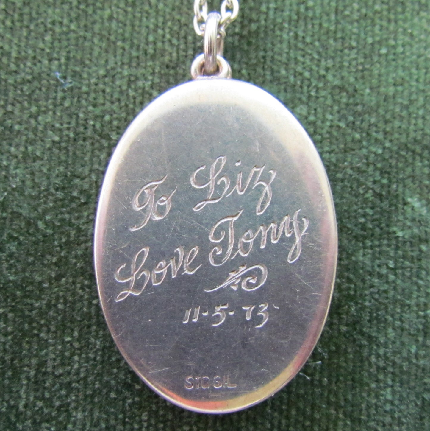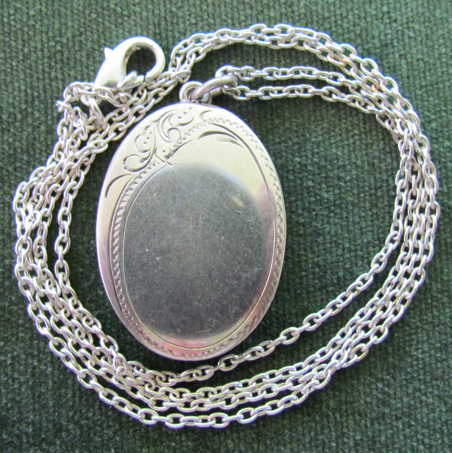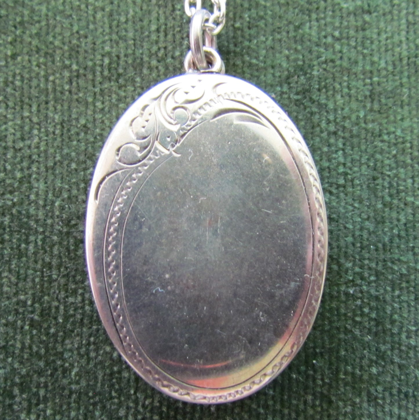 925 Sterling Silver Oval Shaped Photo Locket Having Chased Decoration To Front With Chain. Monogrammed on the back. Please view images as all images are of the actual item.