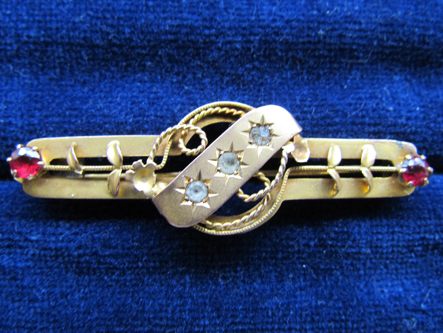 9ct Gold Bar Brooch Set With 2 Garnets And 3 Clear Paste Stones