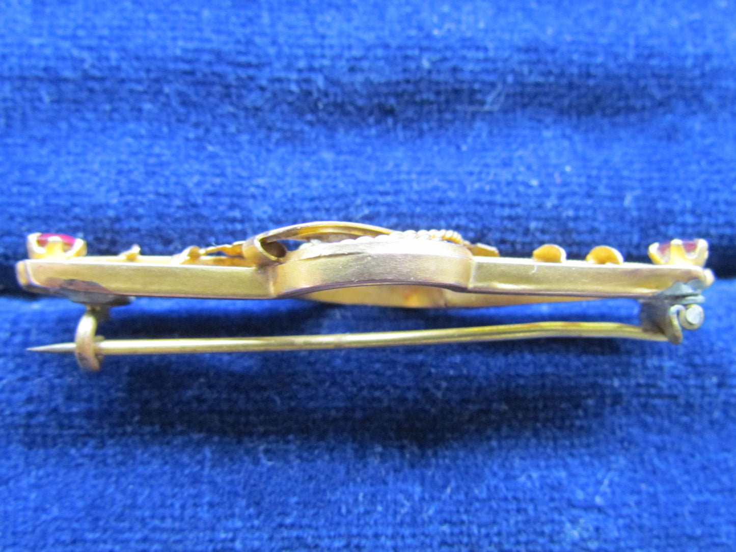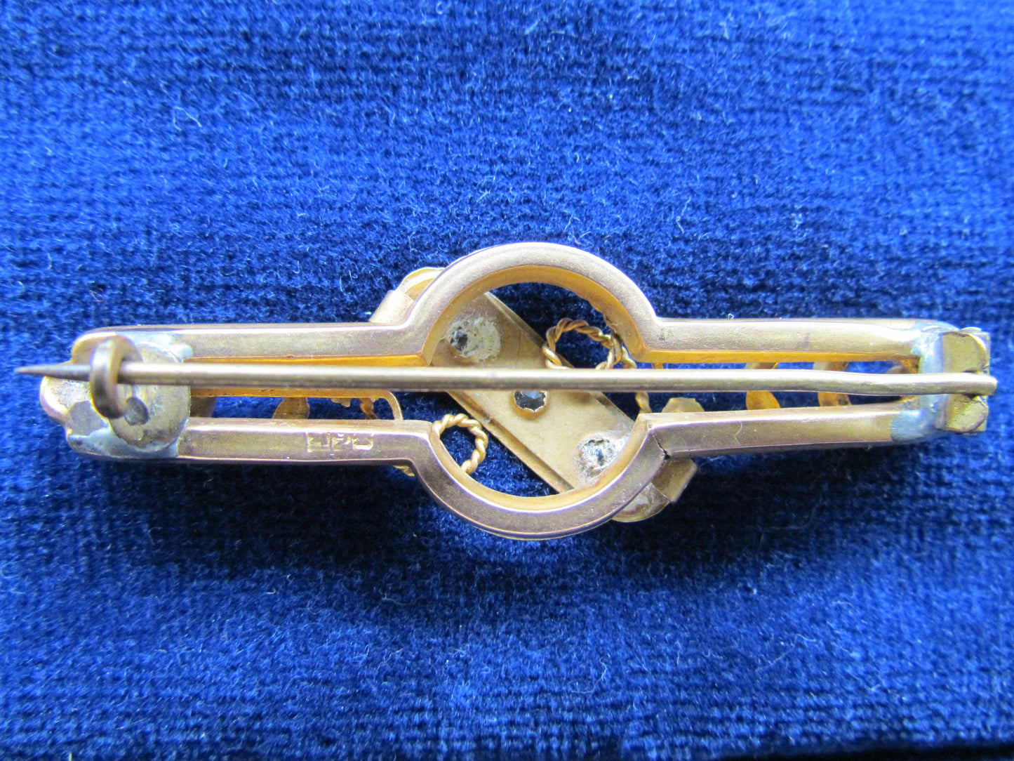 9ct Gold Bar Brooch Set With 2 Garnets And 3 Clear Paste Stones. A well used and poorly repaired piece when viewed from the back having some distortion. Please view images as all images are of the actual item.