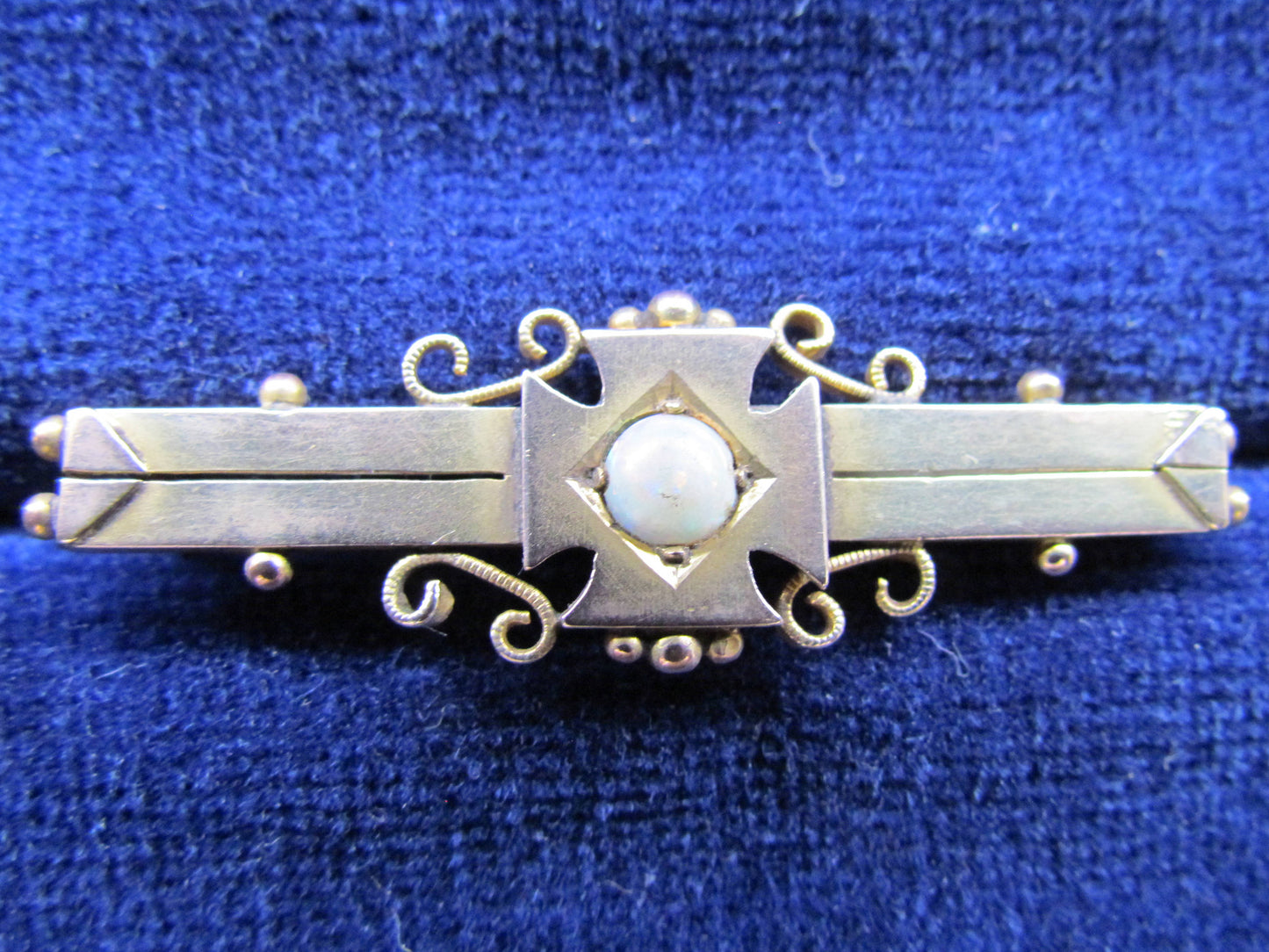 9ct Gold Bar Brooch Set With A Milk / White Opal In A Maltese Cross