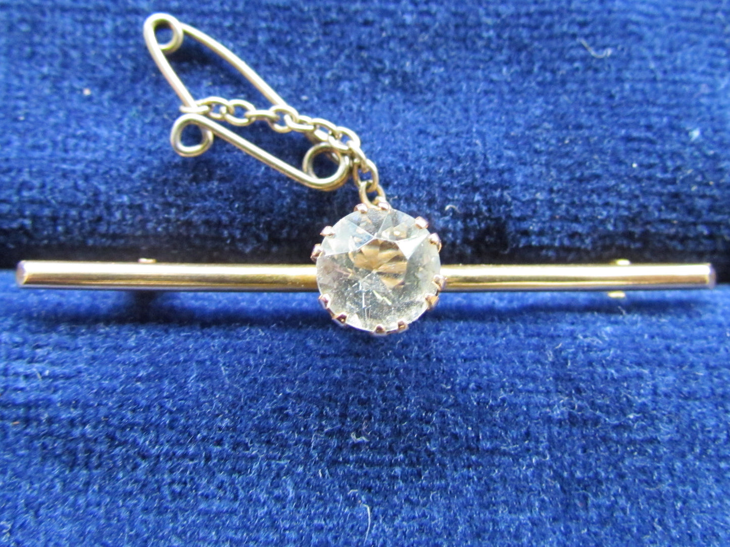 9ct Gold Bar Brooch With Claw Set Synthetic (Paste) Stone. Please view images as all images are of the actual item.
