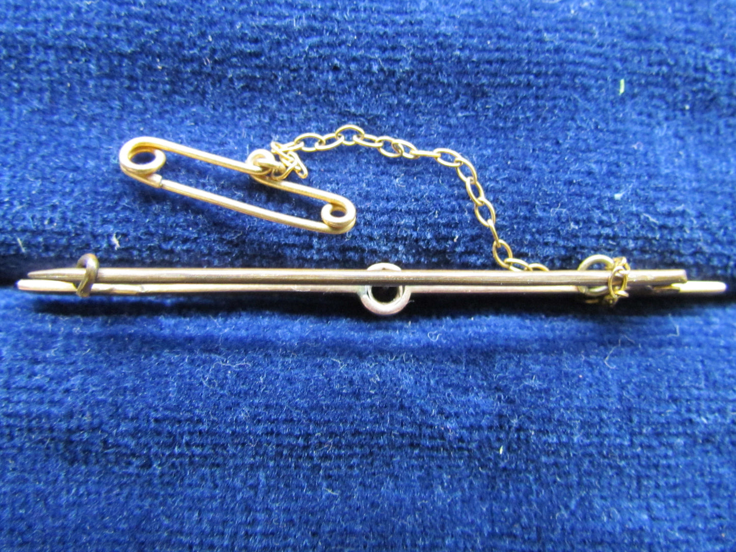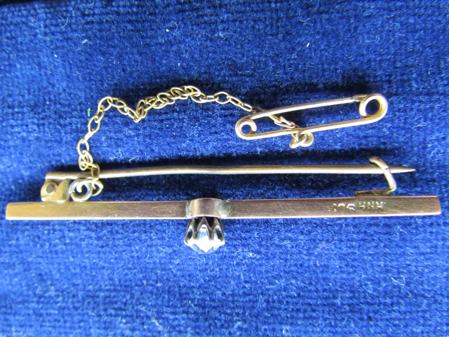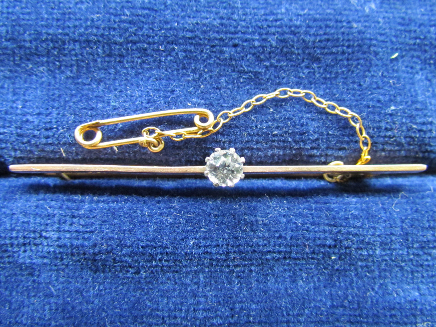 9ct Gold Bar Brooch With Claw Set White Sapphire. Please view images as all images are of the actual item.
