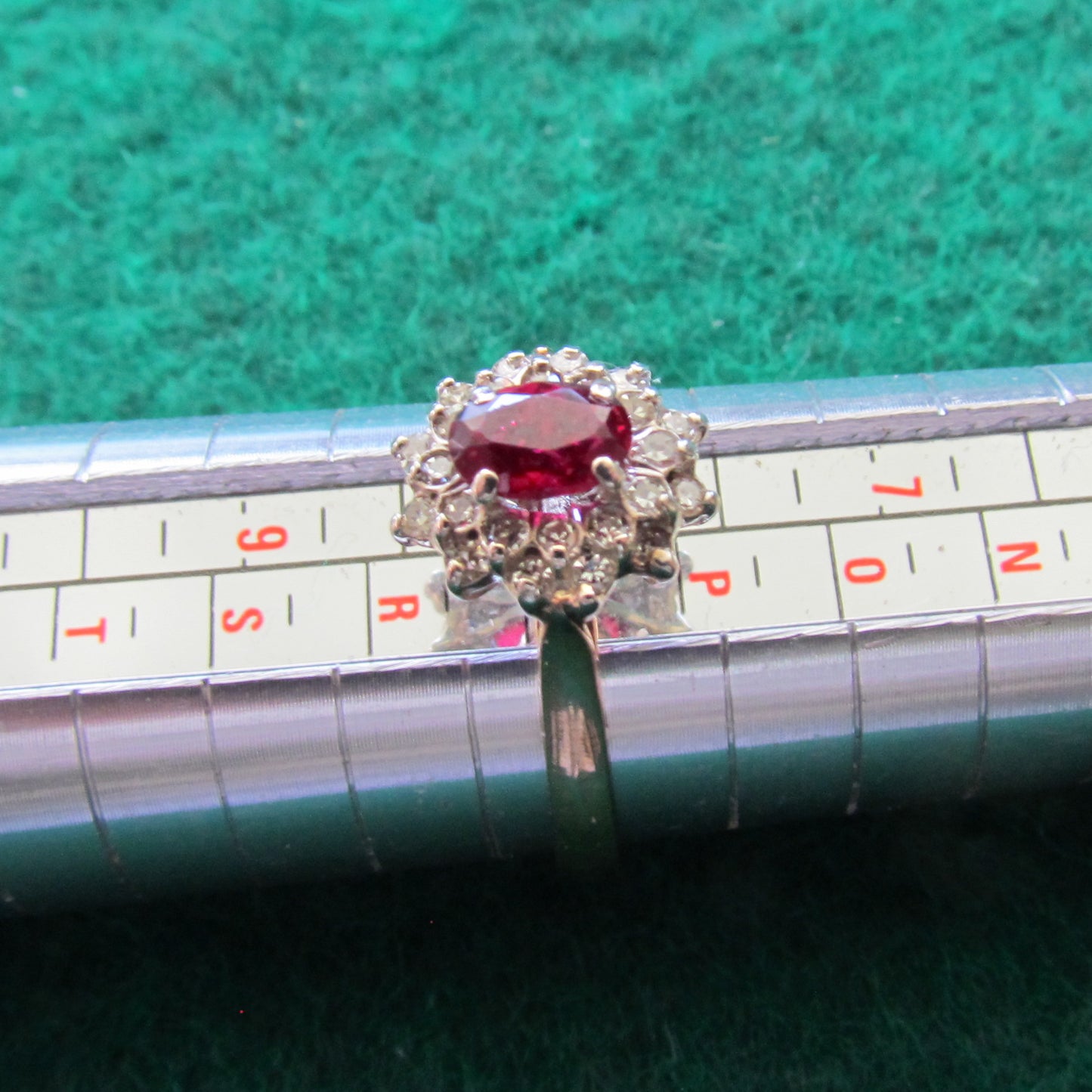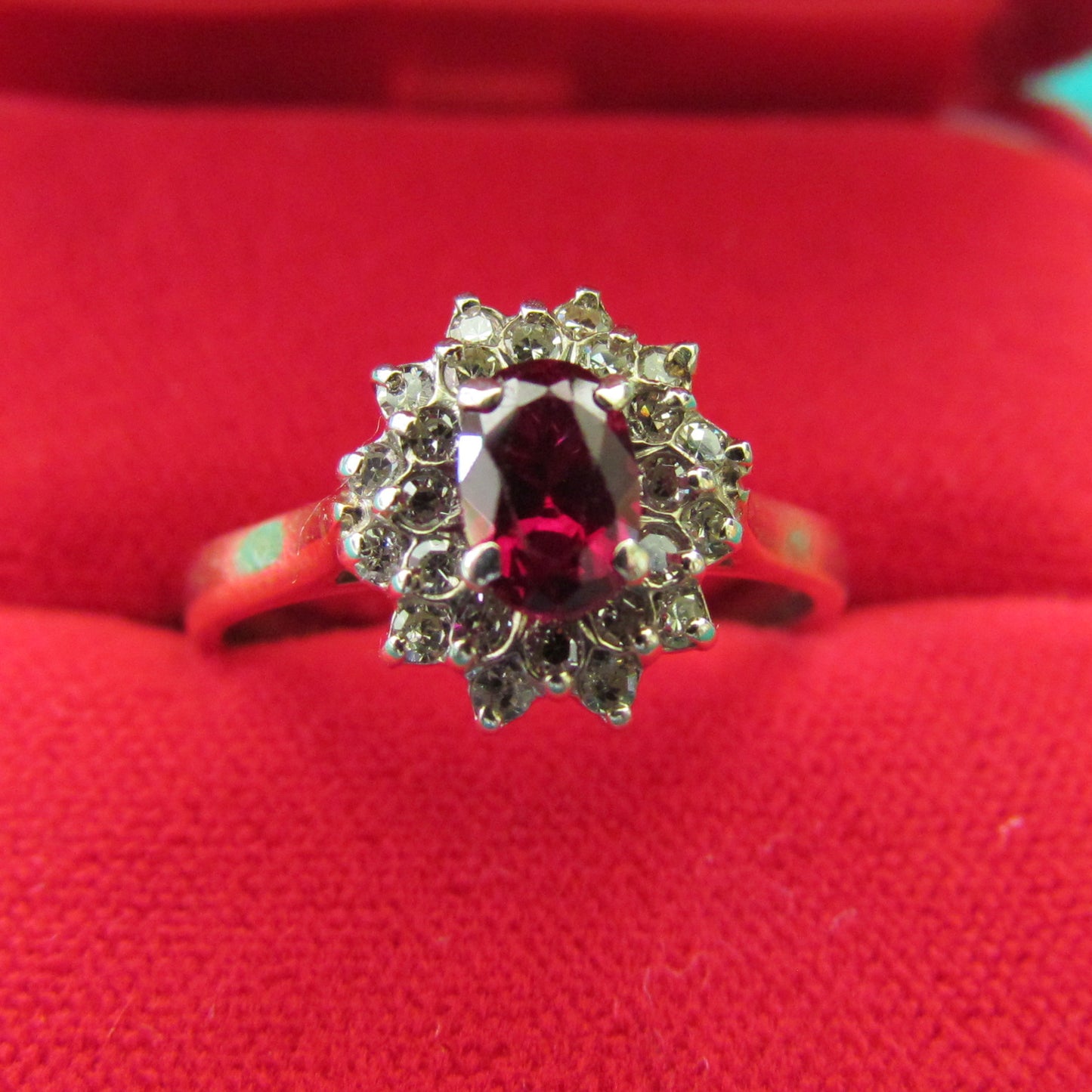 9ct Gold Garnet & Diamond Dress Ring 2.92gms. Yellow gold setting with a raised oval cut ruby surrounded with a cluster of diamonds. Please view images as all images are of the actual item. The ruby is approximately 6mm x 4mm.