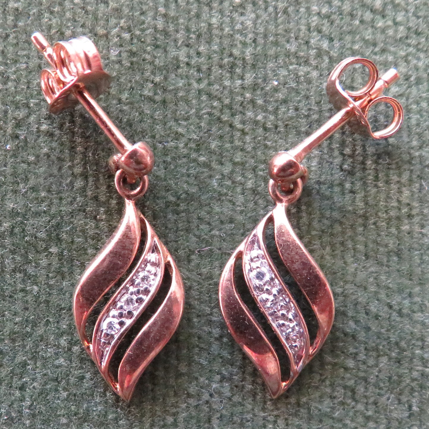 9ct Gold Leaf Shaped Earrings Set With Diamond Chips For Pierced Ears. Please view images as all images are of the actual item.