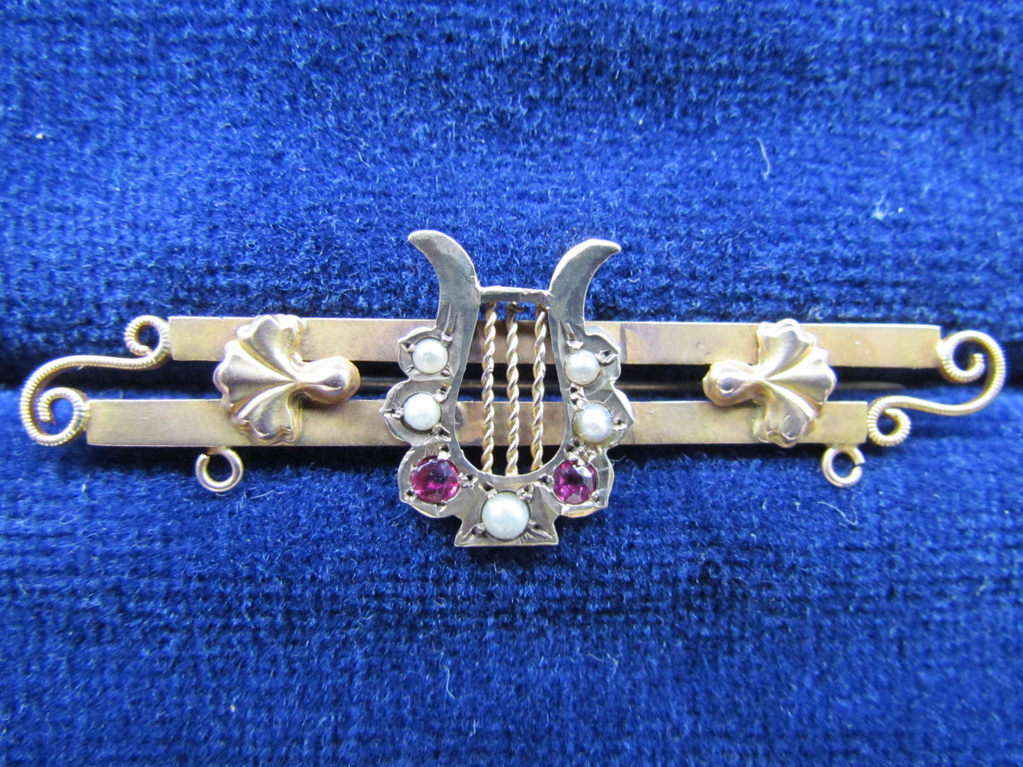 9ct Gold Lyre Set Bar Brooch Having Ruby & Seed Pearl Insets Hallmarked