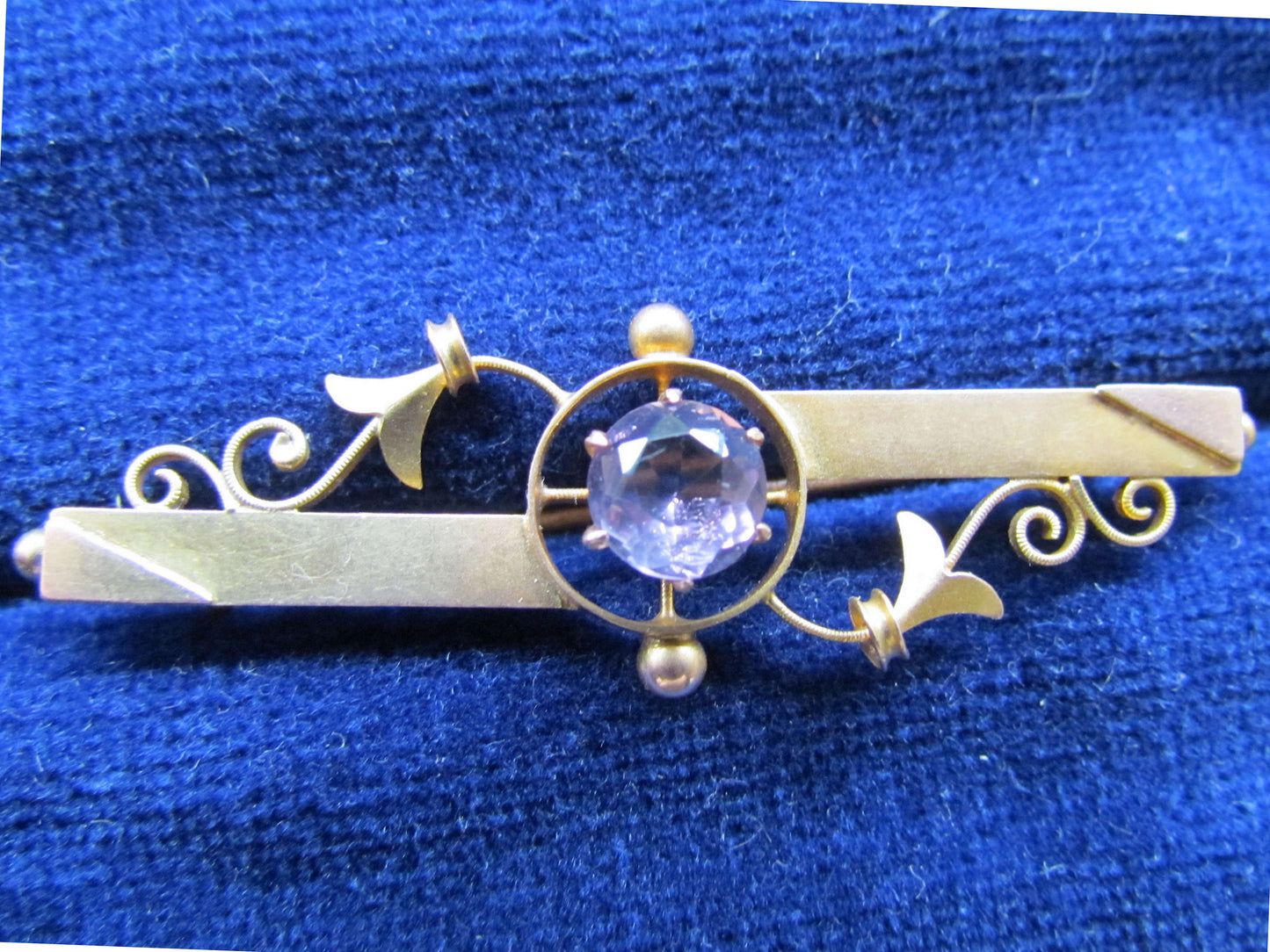 9ct Gold Offset Bar Brooch With Claw Set Amethyst. Please view images as all images are of the actual item.
