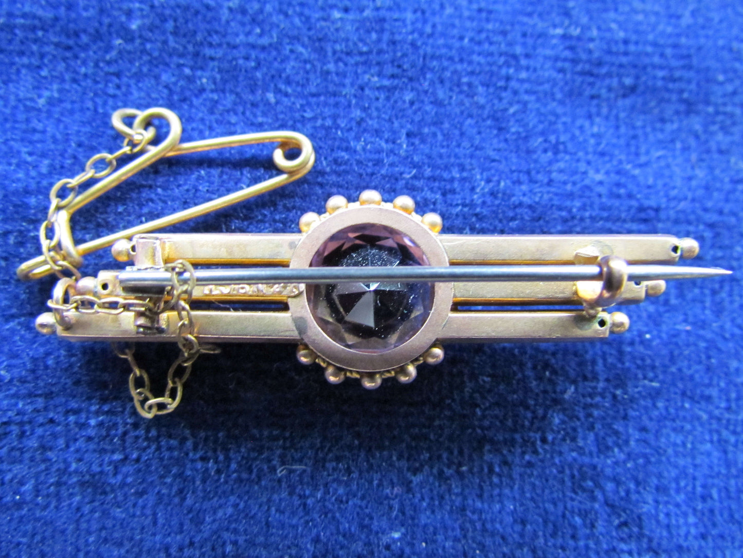 9ct Gold Triple Bar Brooch With Bezel Set Amethyst And Safety Chain Maker H&N