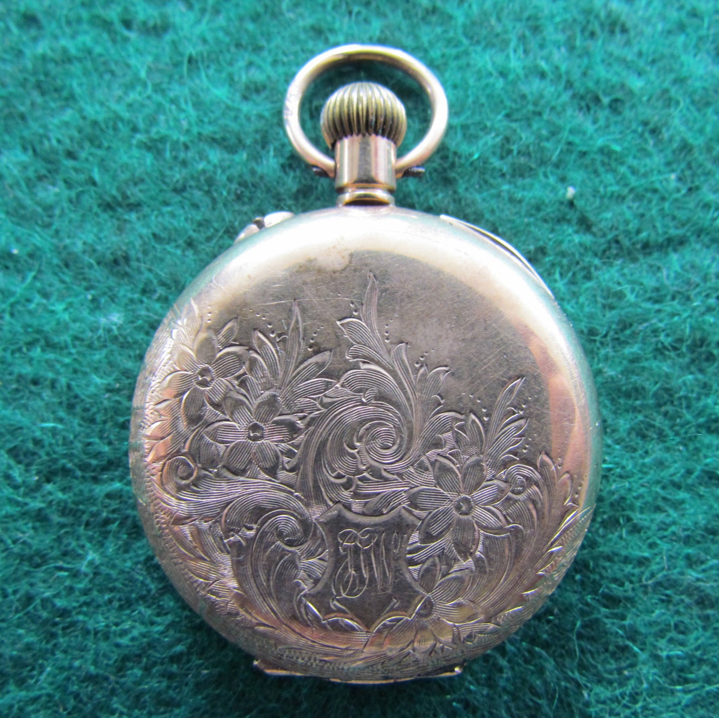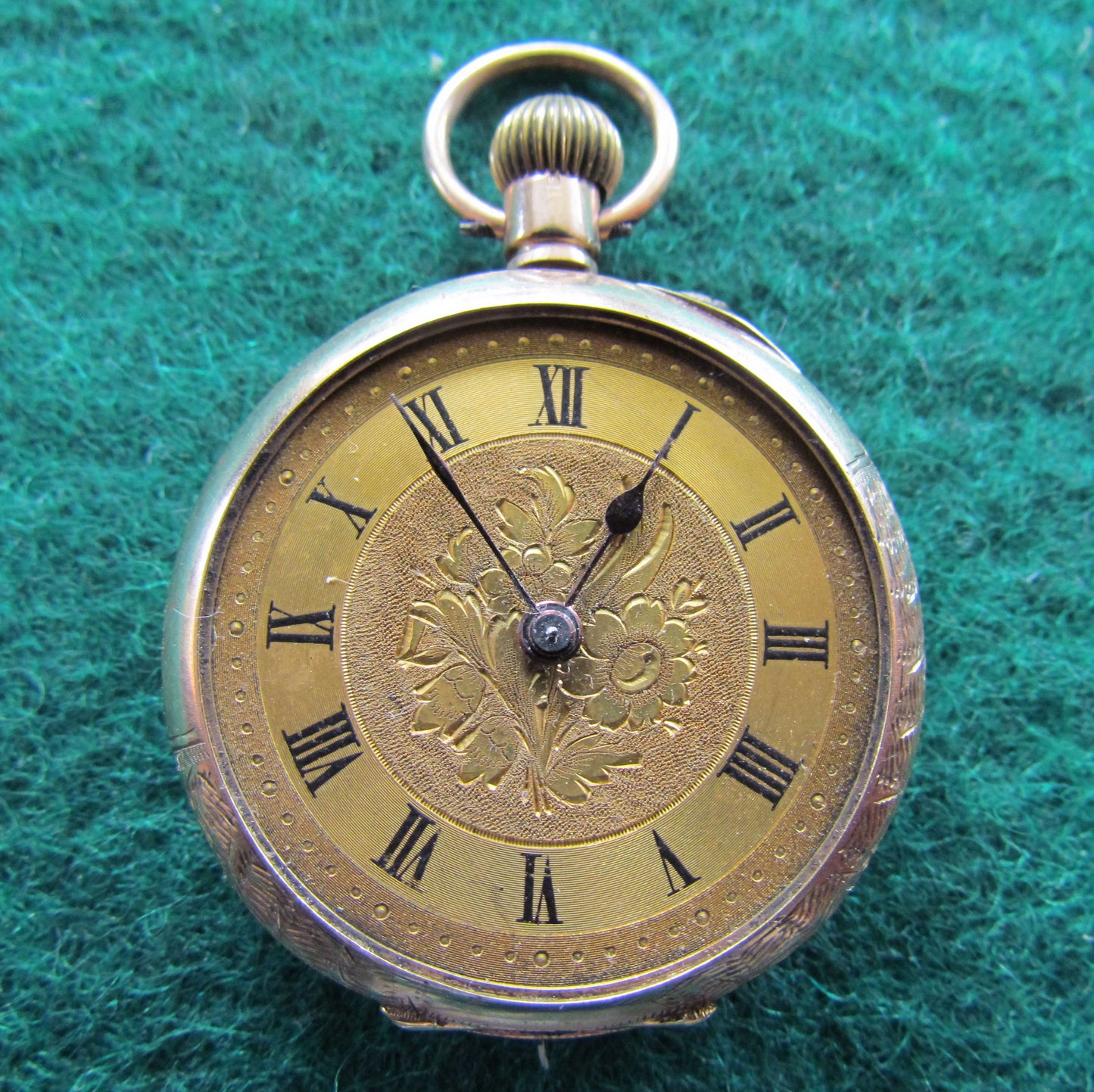9ct Gold Unidentified Open Faceted Ladies Pocket Watch Swiss Made c1918. A 9ct hand chased case with gilt machine turned face also hand chased inside the chapter ring. Roman numerals with black spade hands, works momentarily. An estate item in as found condition without warranty in as described condition, needs servicing. All images are of the actual item, please view.