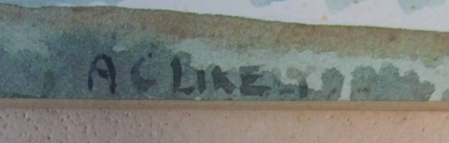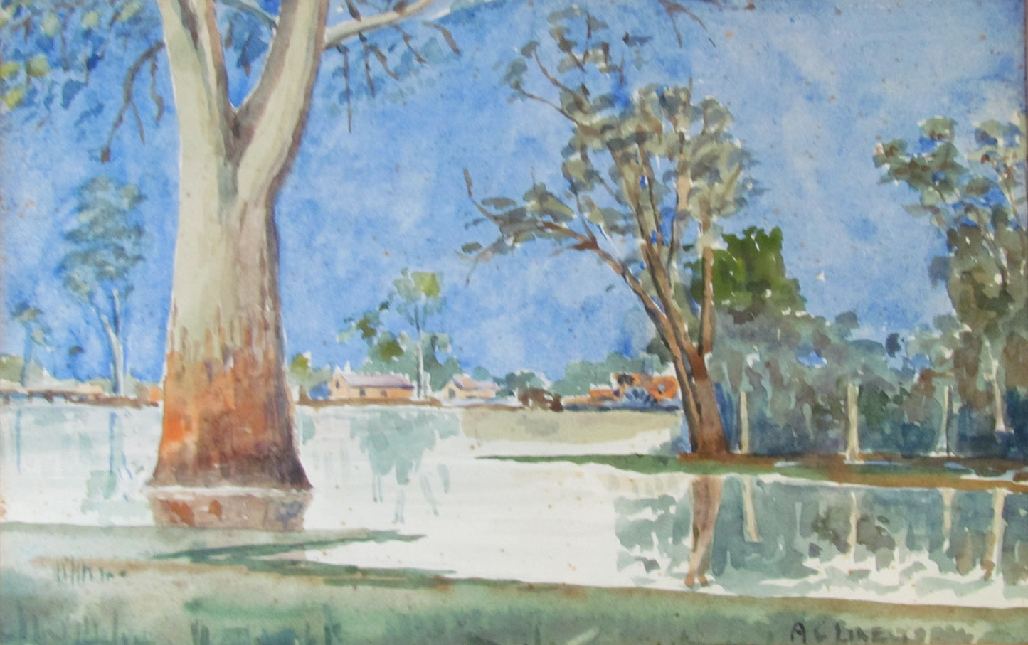 A C Likely Watercolour Bush Scene. An Australian untitled watercolour of a ush scene depicting a homestead in the background and floodwaters in the foreground with fauxing in need of maintenance. Please view images as all images are of the actual item.