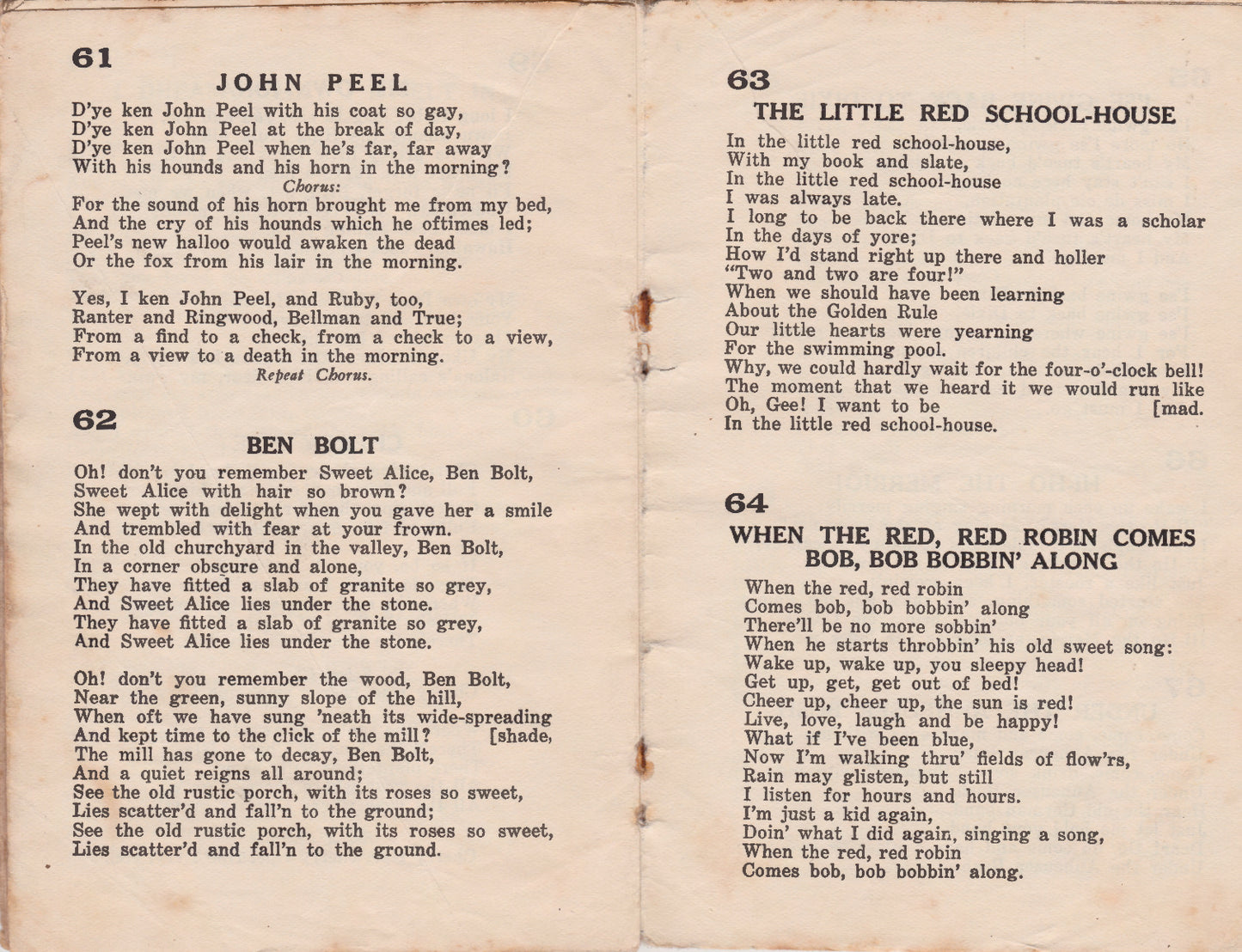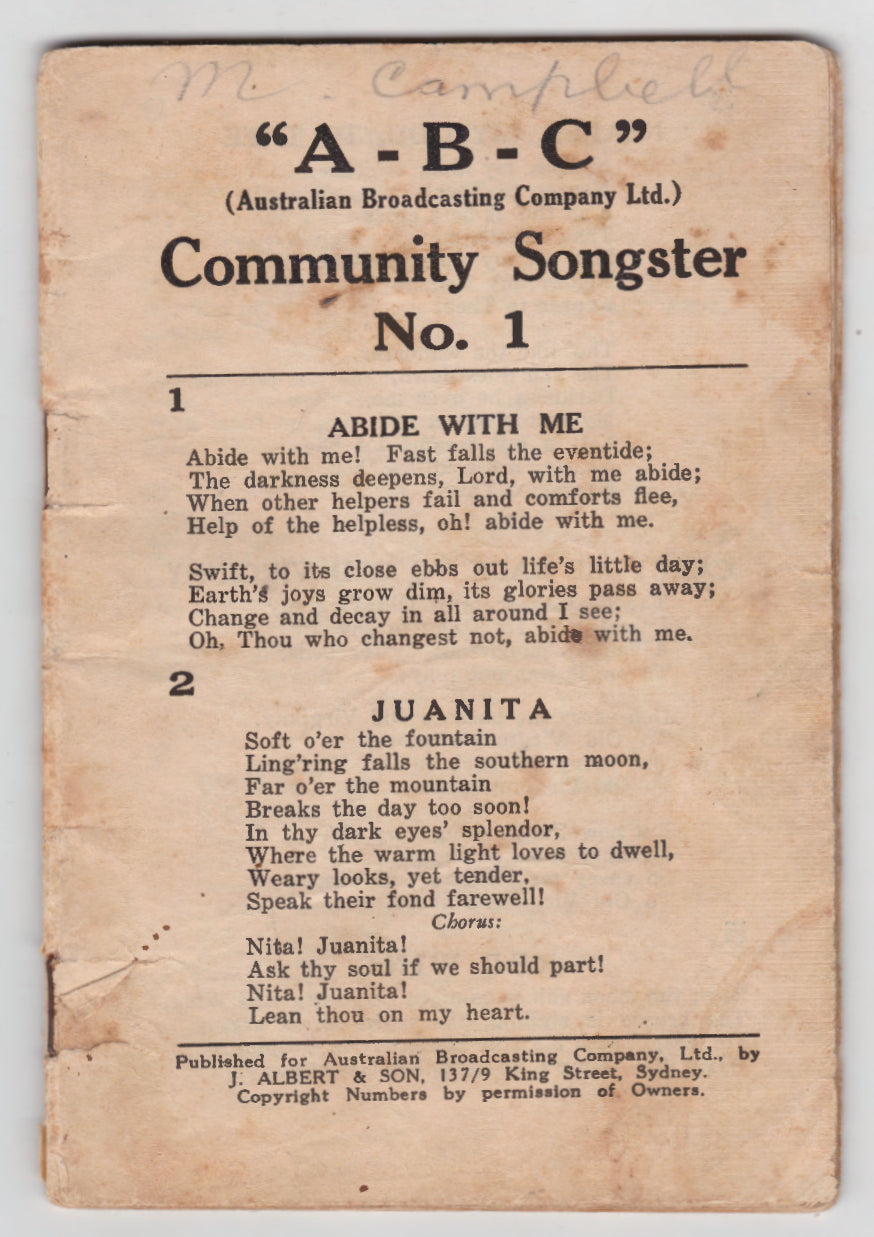 ABC Community Songster No. 1. A hard to find copy in poor to fair condition with cover missing bumped corners & edges, folds & creases 2 centre leaves floating, toned with some fauxing. All images are of the actual item.