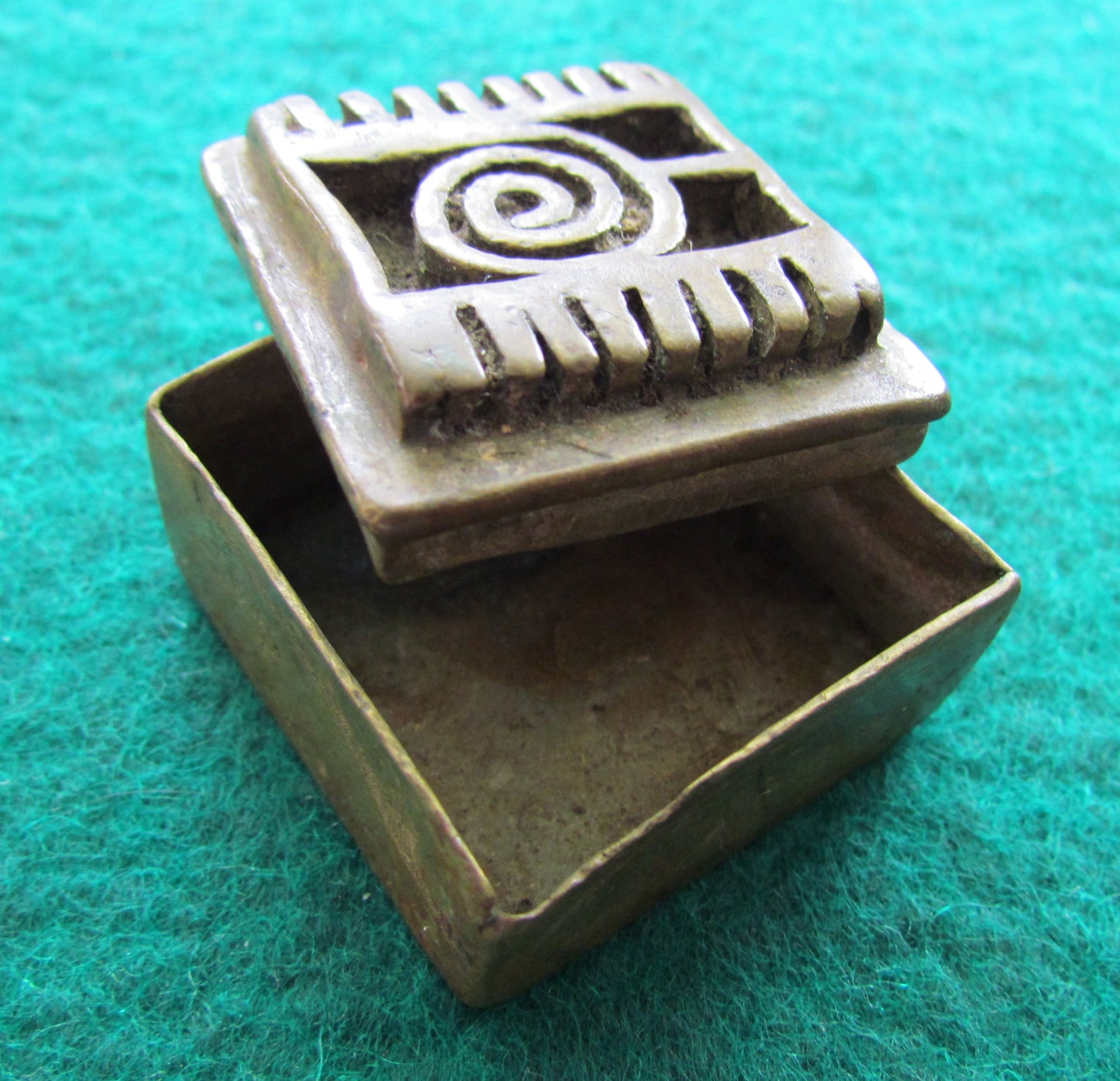 A hard to find African gold dust box from the Ashanti (Asanti) goldfields. A rectangular lidded box made brass, handmade with fitted sides in brass by local gold and silversmiths, used for storing the favored currency prior to 1936 of gold dust. The lid fits relatively tight to the body with a breakout in the base on one corner. The lid has a high relief geometric decoration. Please view images as all images are of the actual item.