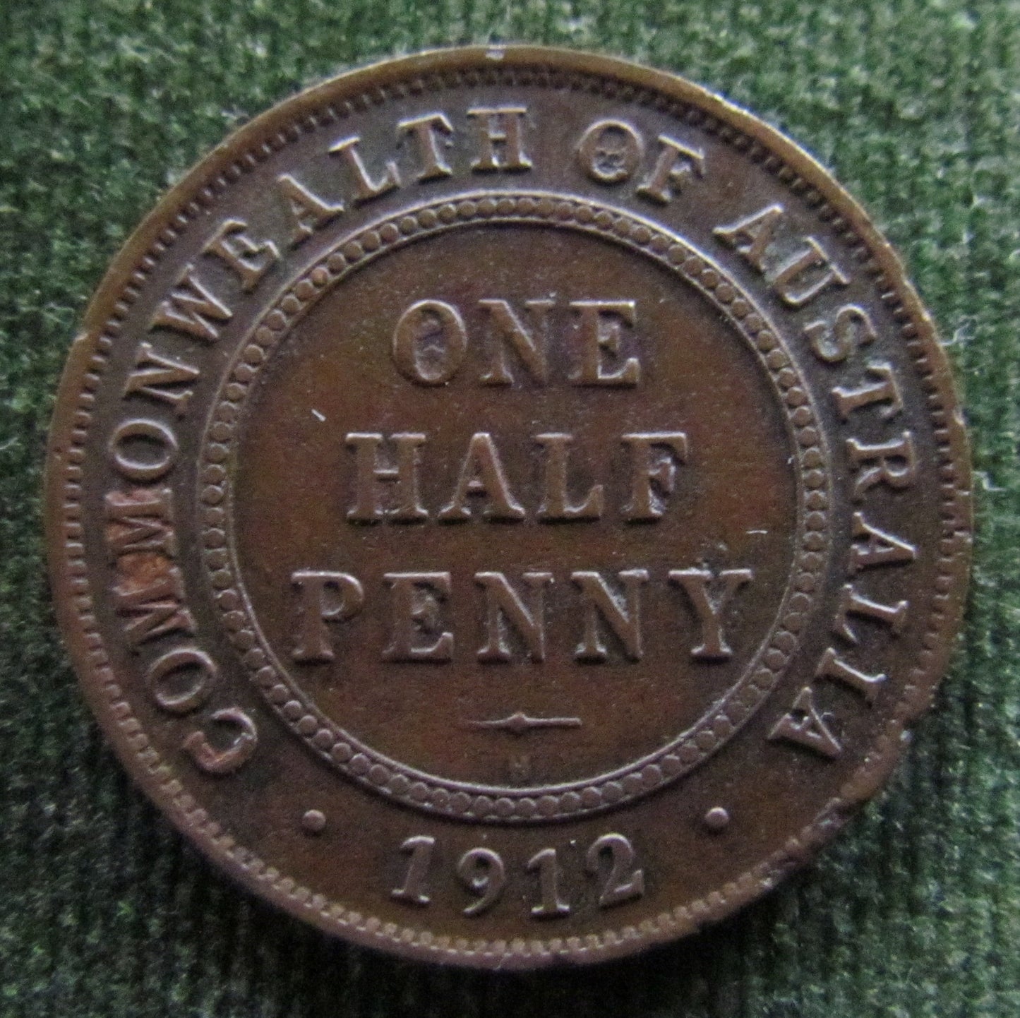 Australian 1912 1/2d Half Penny King George V Coin. A fair quality coin with dark brown toning, well circulated having minor issues. Please view images as all images are of the actual item.