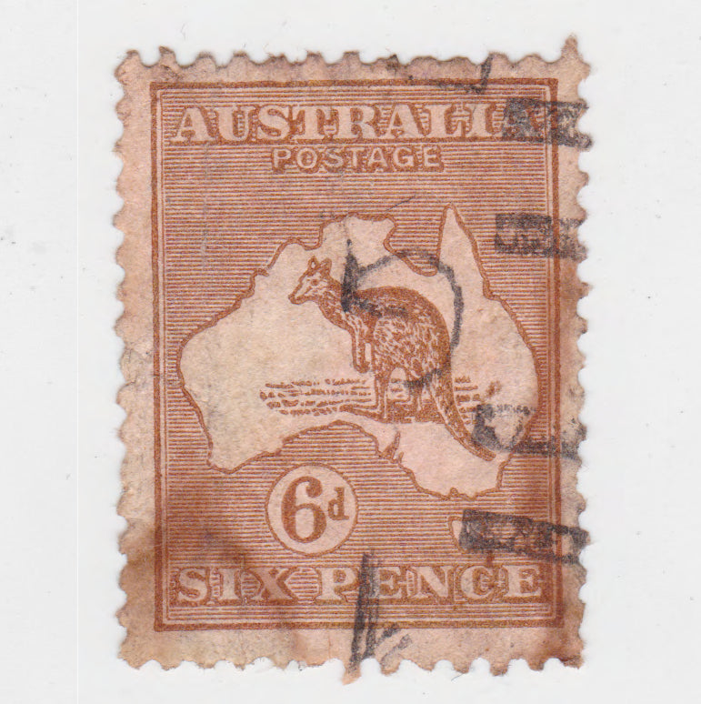 Australian 1913 6d 6 Penny Brown Kangaroo Stamp - Perf: 11.5-12. Wrinkled & stained with light hinge mark. All images are of the actual item.