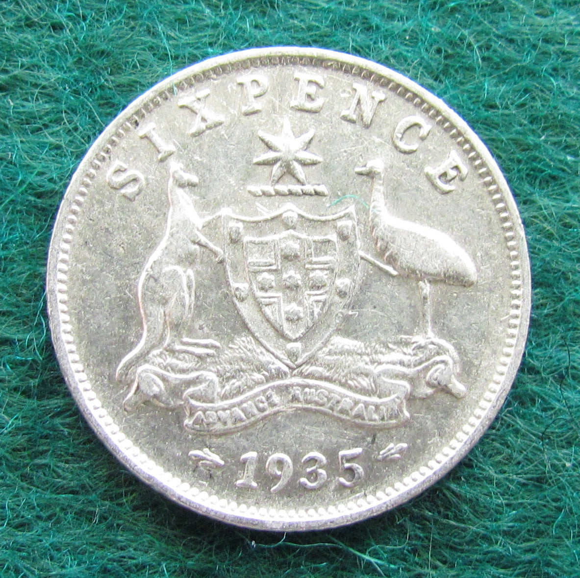 Australian 1935 6d Sixpence King George V Coin - Circulated. A good to very good example, the coin has wear and tear consistent with early removal from circulation. Please view images as all images are of the actual item.