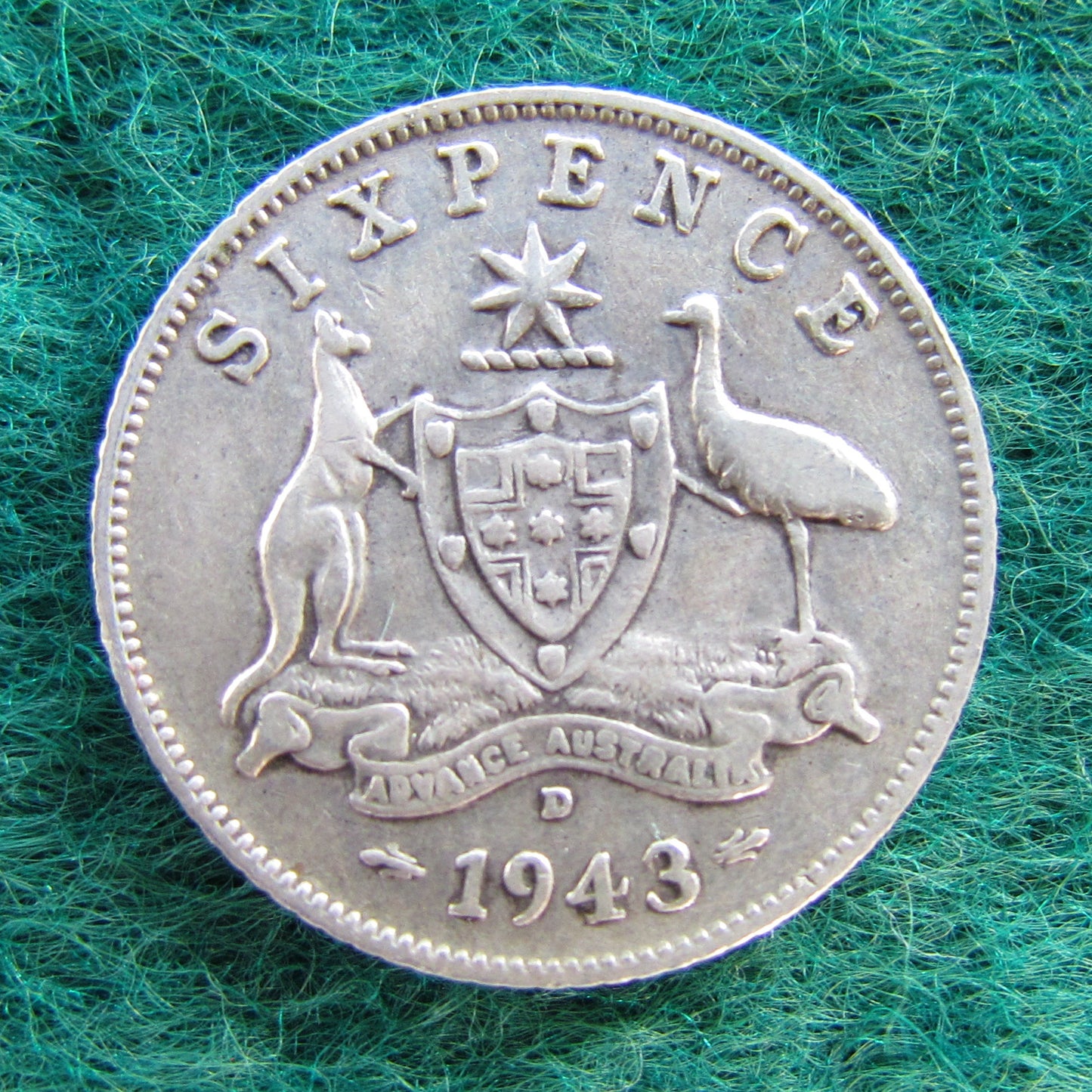 Australian 1943 D 6d Sixpence King George VI Coin - Circulated. A good to better coin showing wear and tear consistent with its period in circulation. Please view images as all images are of the actual item.