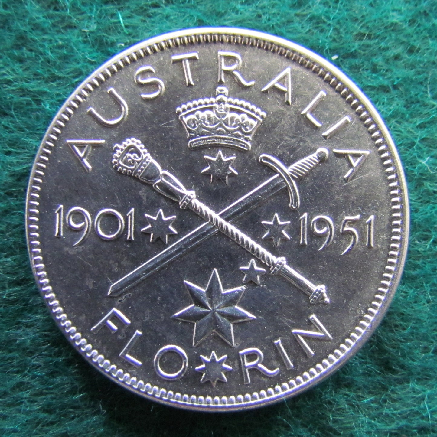Australian 1951 2/- Florin 50th Anniversary Jubilee King George VI Coin - Circulated. A good coin with wear consistent with age and period in circulation. Please view images as all images are of the actual item.