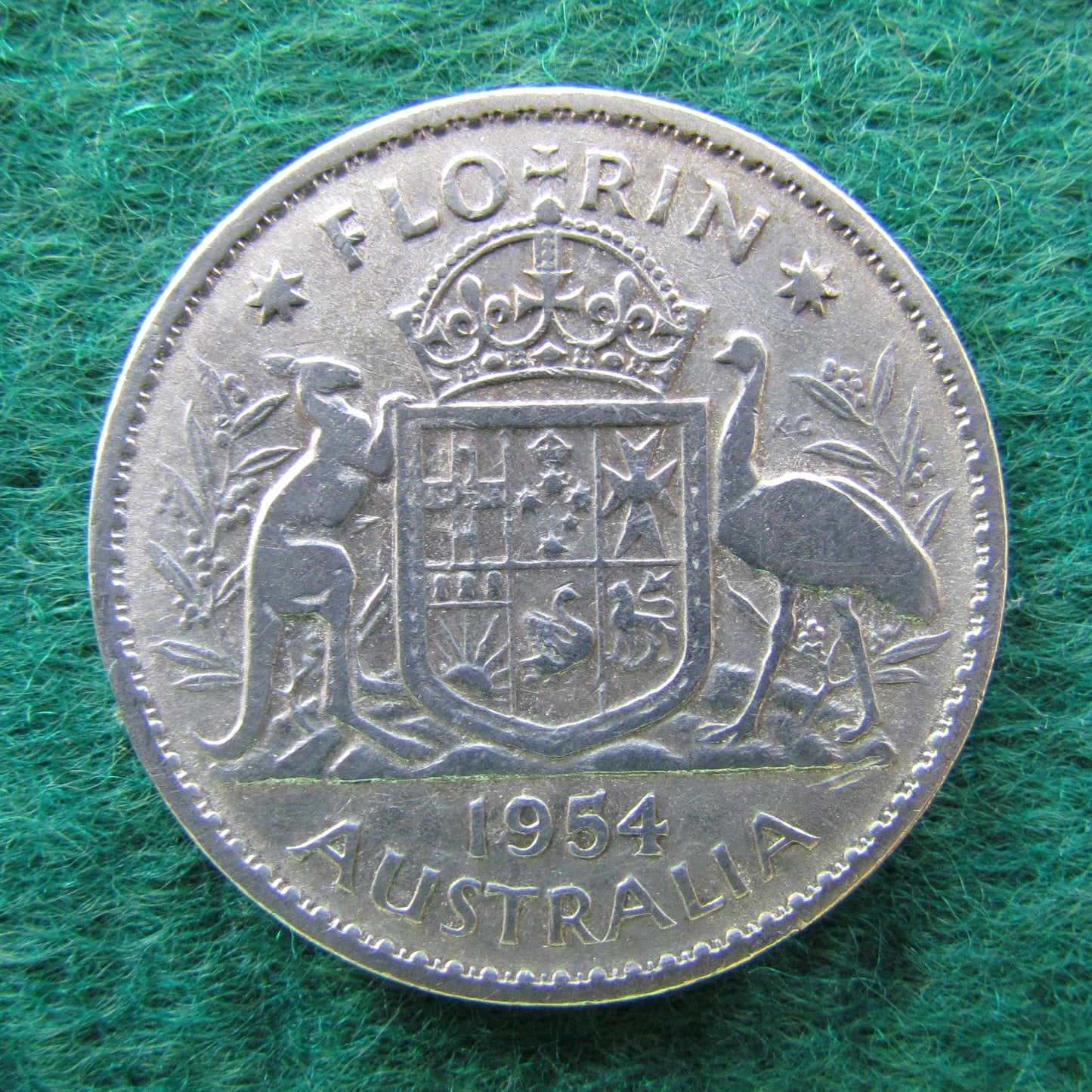 Australian 1954 2/- Florin Queen Elizabeth II Coin - Circulated. A fair to good example showing wear and tear consistent with its period in circulation. Please view images as all images are of the actual item.