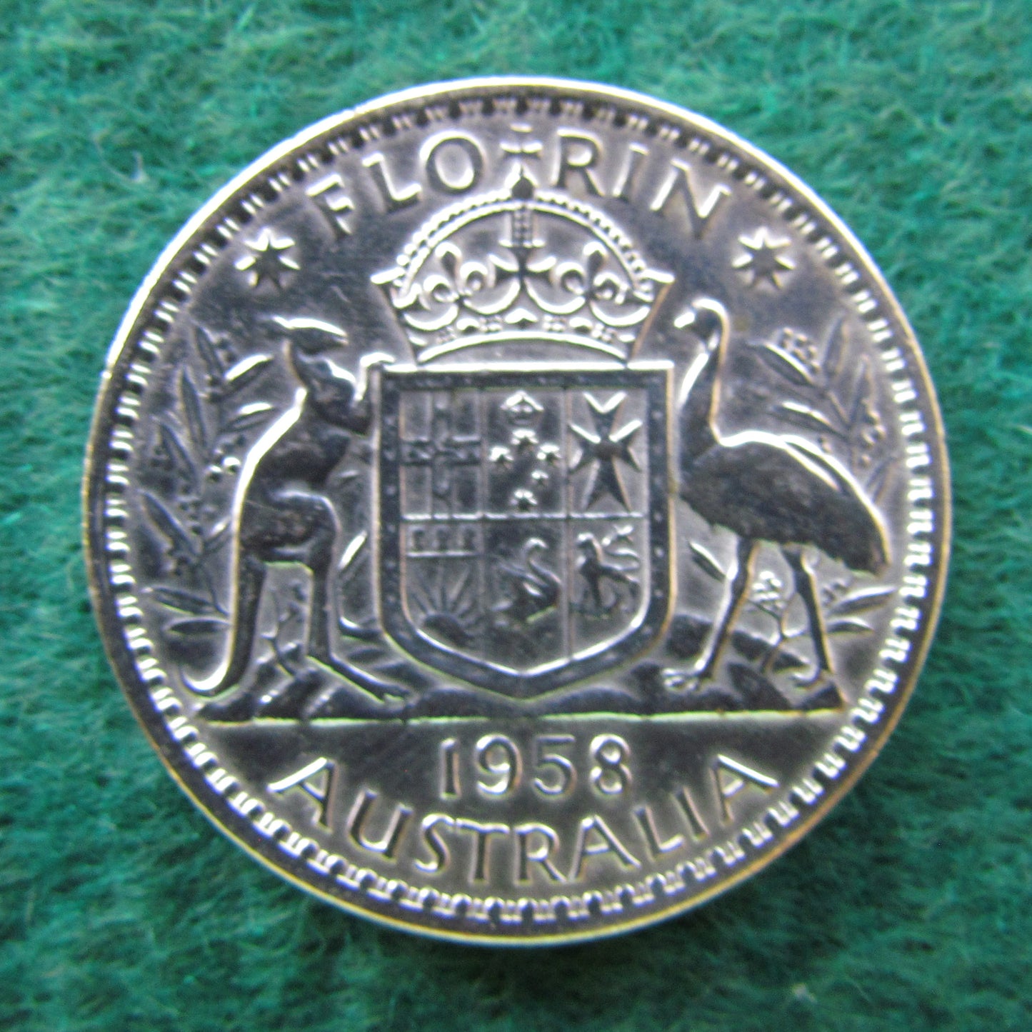 Australian 1958 2/- Florin Queen Elizabeth II Coin - Circulated. A good example in worn condition showing wear and tear consistent with full term circulation. Please view images as all images are of the actual item.