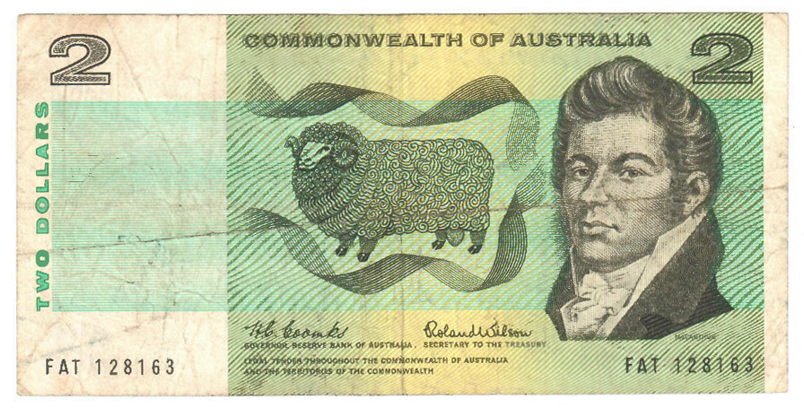 Australian 1966 2 Dollar Coombs Wilson COA Banknote s/n FAT 128163 - Circulated. Grades as F+ as I am not a grader this is purely a guide so please use the link to the grading table and use your own experience and knowledge in regrading this item to you own satisfaction. Please view images as all images shown are of the actual item. This note has folds, creases and wrinkles with relatively sharp edges.