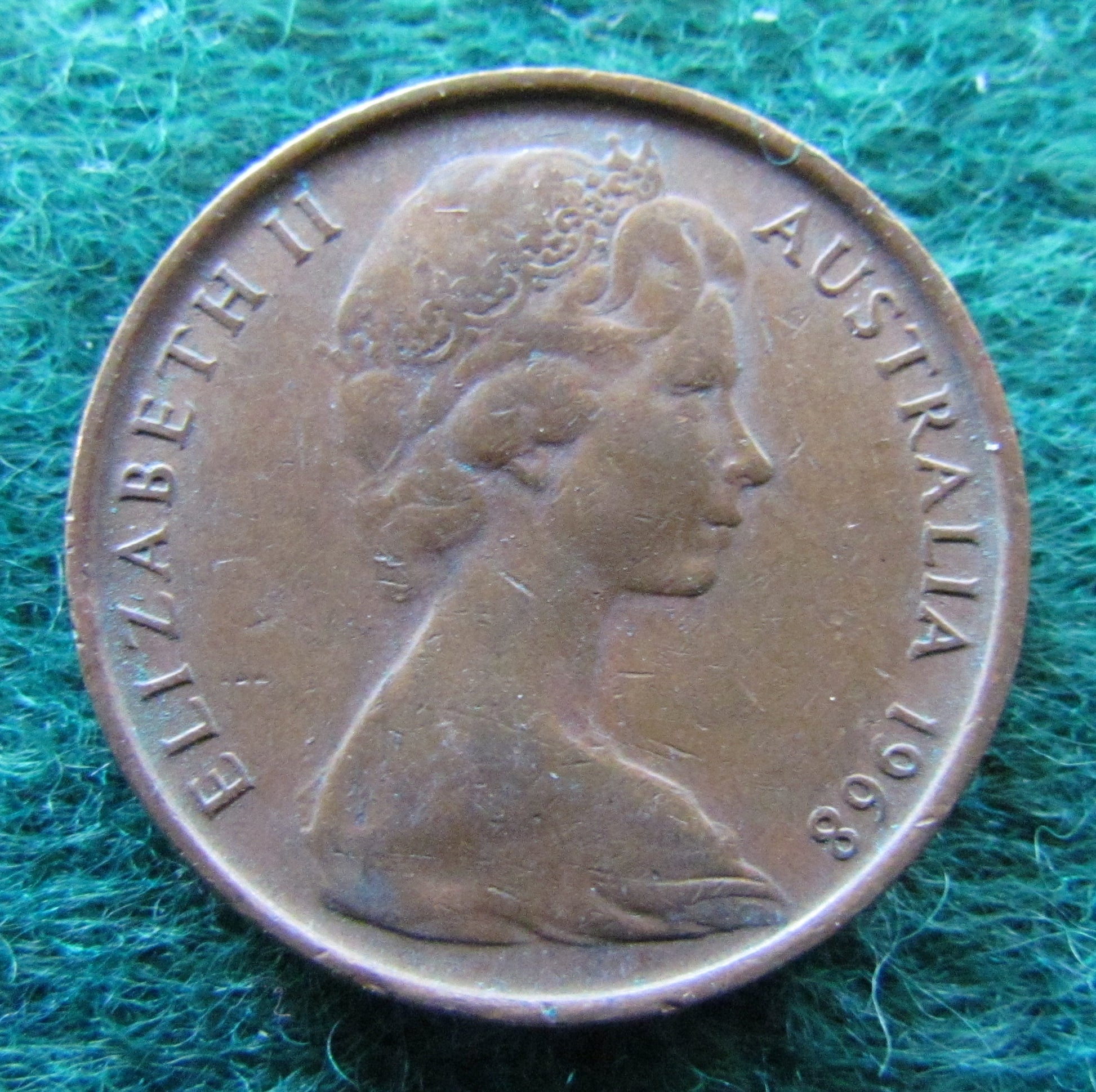 Australian 1968 2 Cent Queen Elizabeth II Coin. A good coin showing wear consistent with early removal from circulation with a few blemishes and knocks. Please view images as all images are of the actual item.
