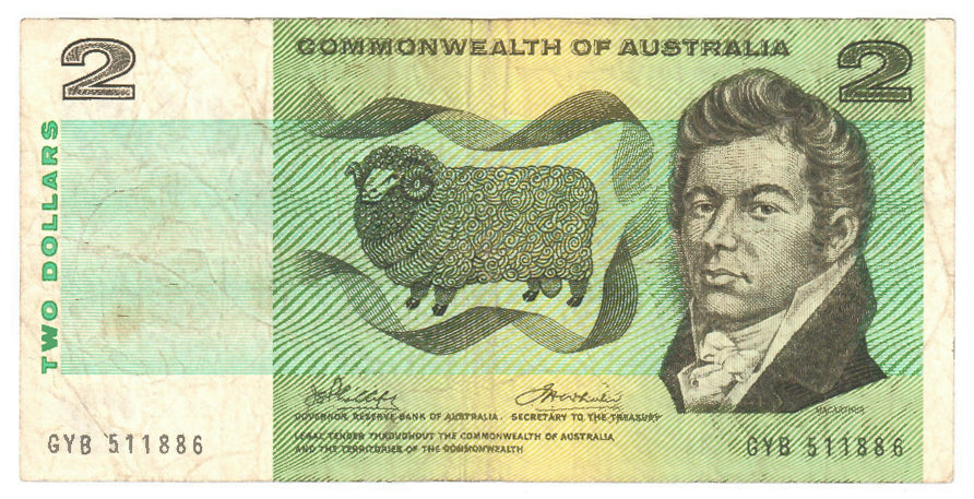 Australian 1972 2 Dollar Phillips Wheeler COA Note s/n GYB 511886 - Circulated