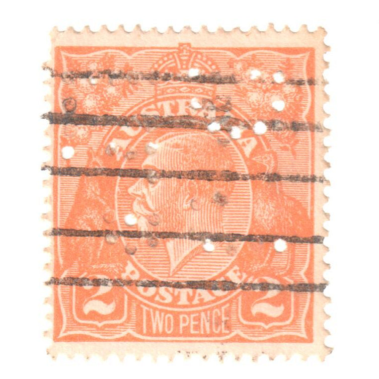 Australian 2 Penny Orange King George V Stamp. Perforation Variant. All images are of the actual item.