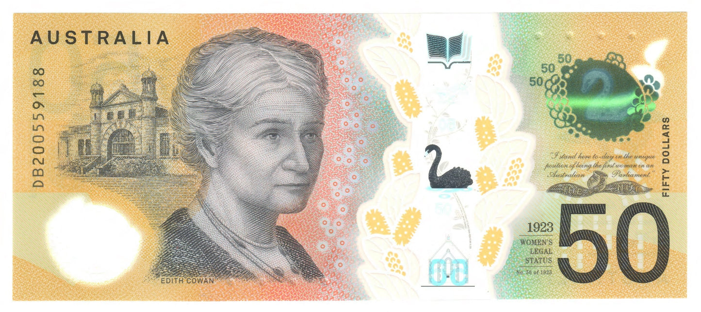 Australian 2020 50 Dollar Lowe Gaetjens Polymer Banknote s/n DB200559188 - Circulated