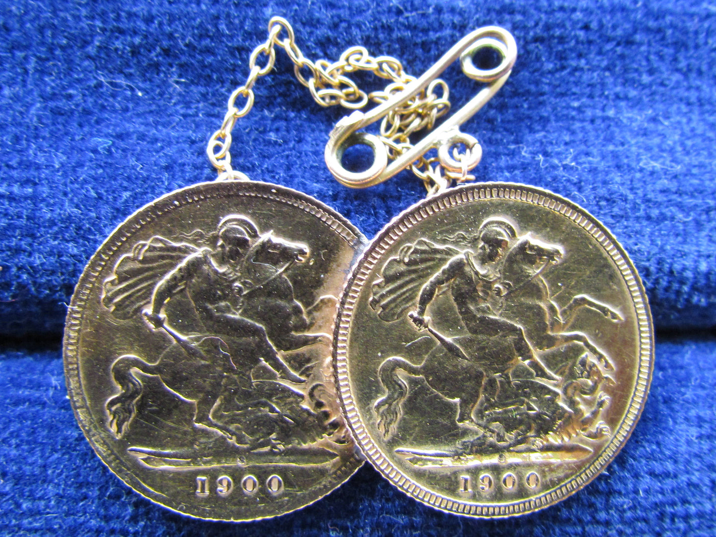Australian 22ct Gold 1900 Half Sovereign Coin Brooch (Sydney Mint). 2 coins. Please view images as part of the description. Please view Images as all images are of the actual item.
