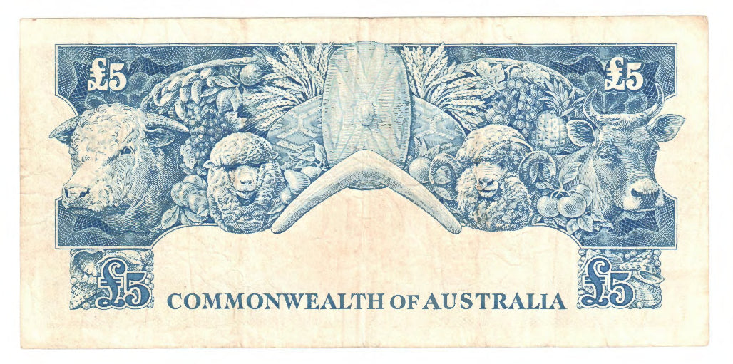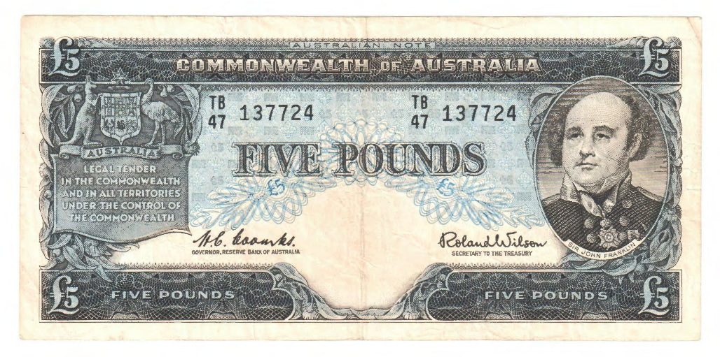 Australian 1960 5 Pound Coombs Wilson Banknote s/n First TB/47 137724 - Circulated