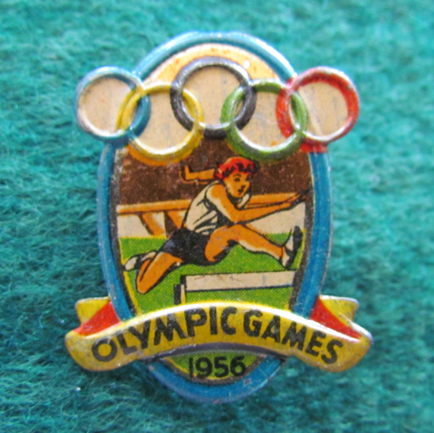 Australian Melbourne 1956 Olympic Games Hurdling Tin Badge. A good example of an extremely hard to find badge showing some wear and tear with a few chips, scratches and minor pitting from natural oxidisation, please view images. All images shown are actual item.