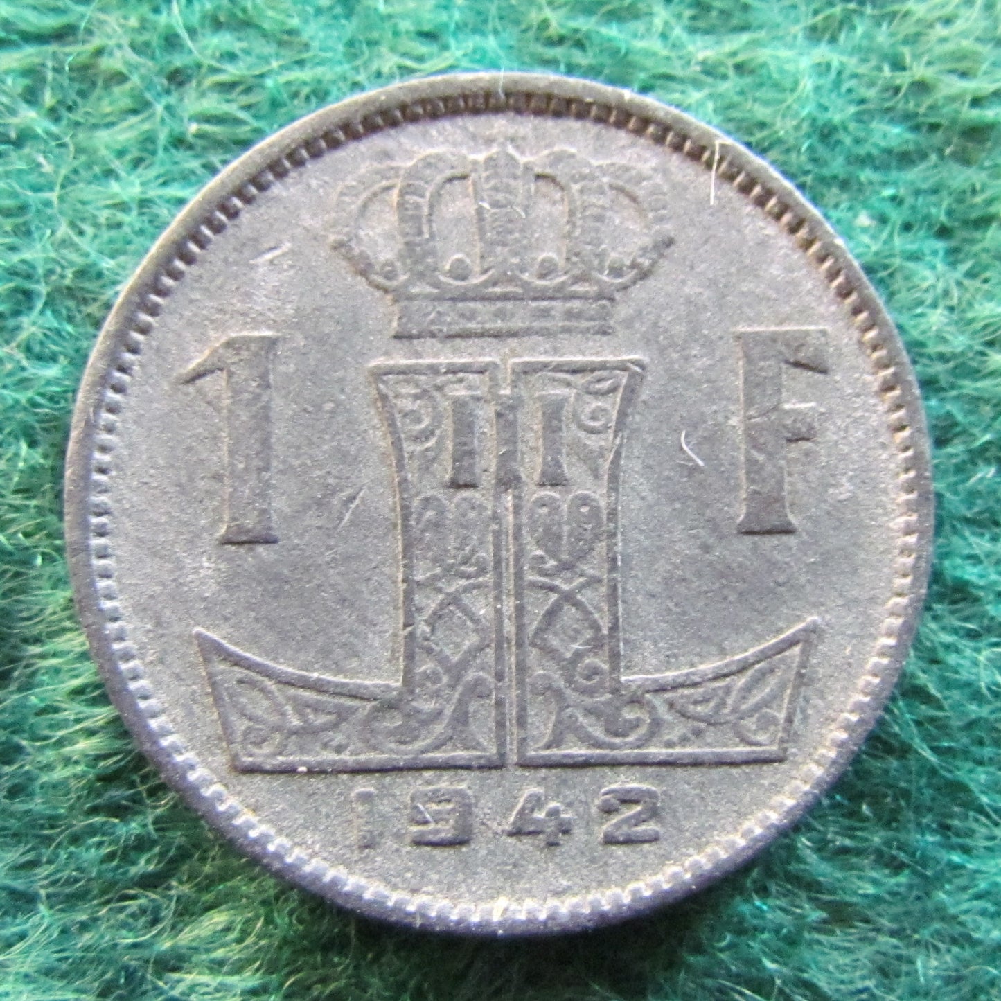 Belgium 1942 1 Franc Coin - WWII Currency - Circulated. A good coin with an even zinc oxidised patina consistent with its age and period in circulation, brought to Australia by a returning soldier, please view images. Please view images as all images shown are of the actual item.