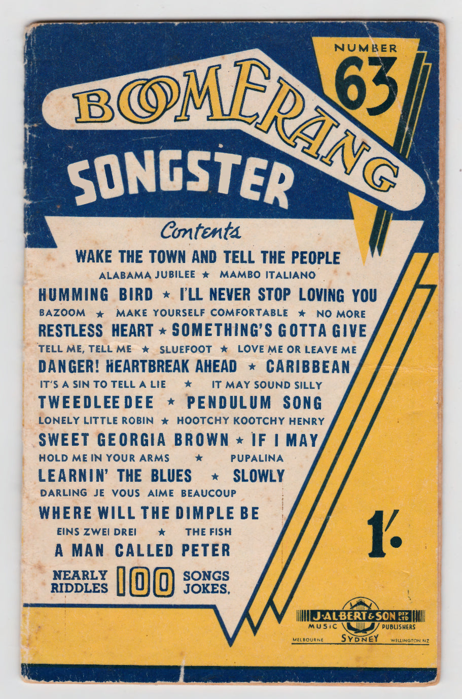 Boomerang Songster No. 63. A hard to find copy in fair to good condition has rubs, fold, creases and toning consistant with usage for it age. All images are of the actual item.