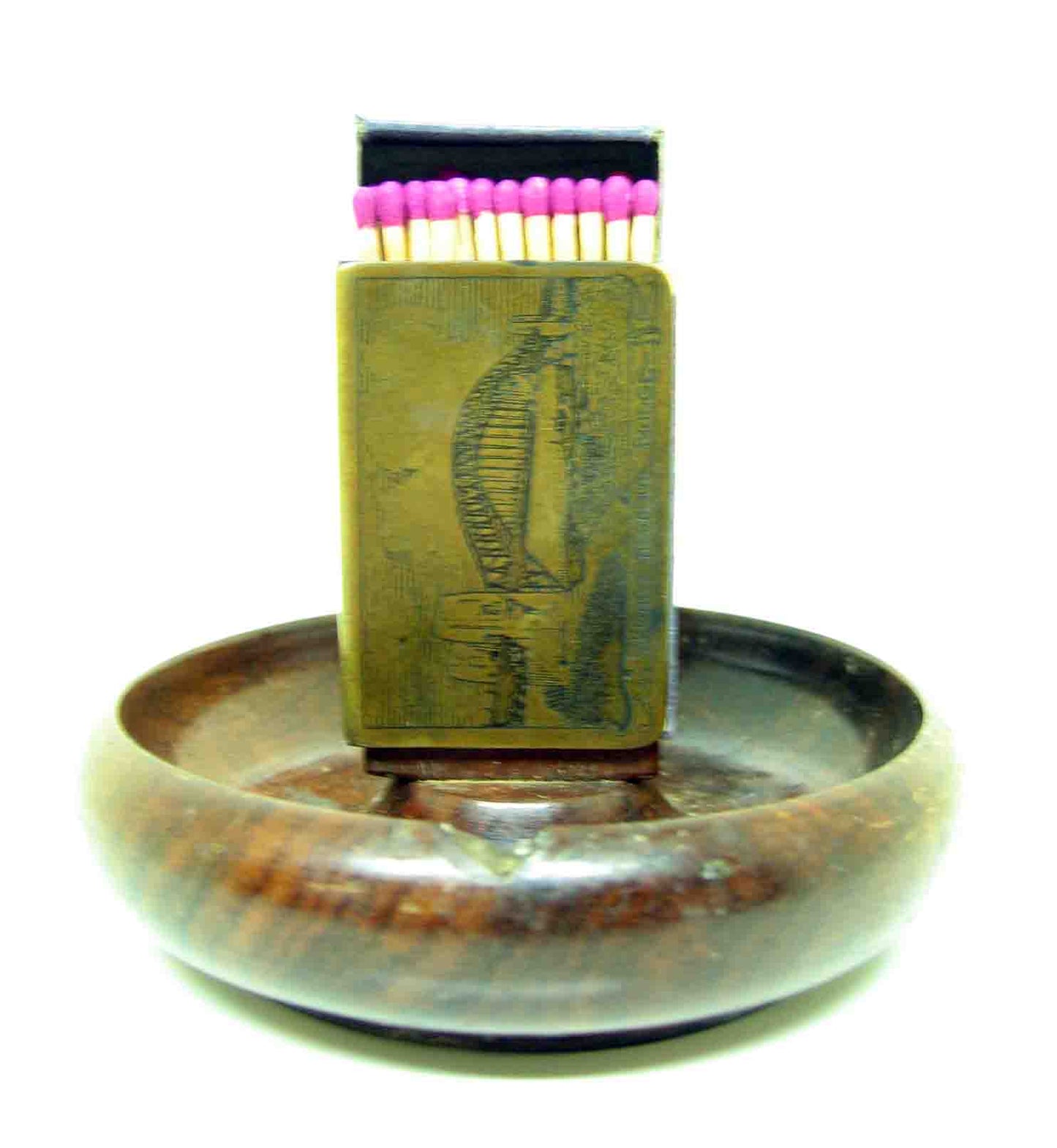 Harbour Bridge brass match cover and blackwood stand. Please view images as all images are of the actual item.