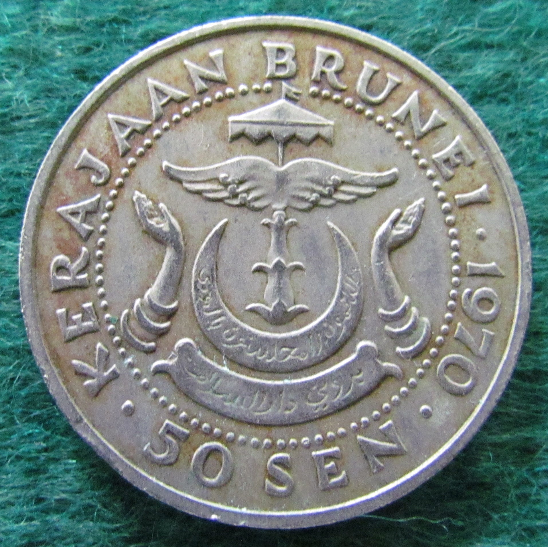 Brunei 1970 50 Sen Coin Sultan Hassanal Bolkiah. A good coin showing wear and handling consistent with a moderate period in circulation. Please view images as all images shown are of the actual item.