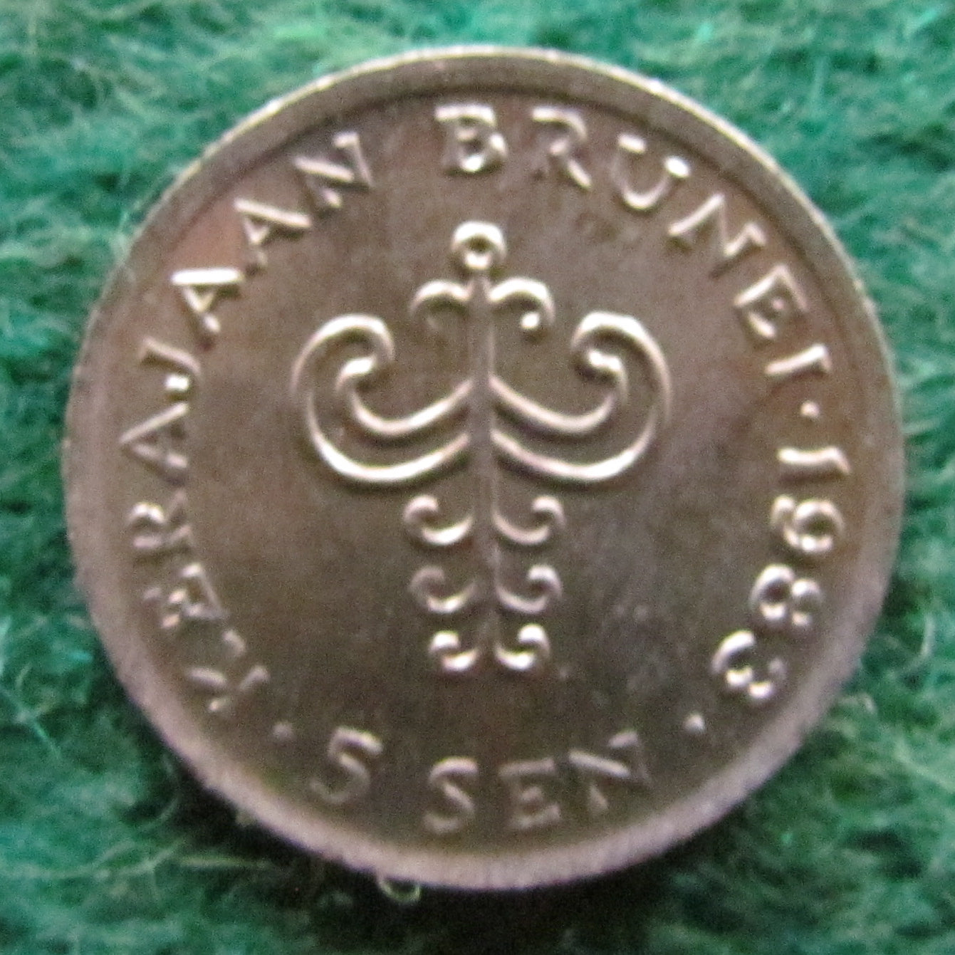 Brunei 1983 5 Sen Coin Sultan Hassanal Bolkiah. A very good coin showing wear and handling consistent with early removal from circulation. Please view images as all images shown are of the actual item.