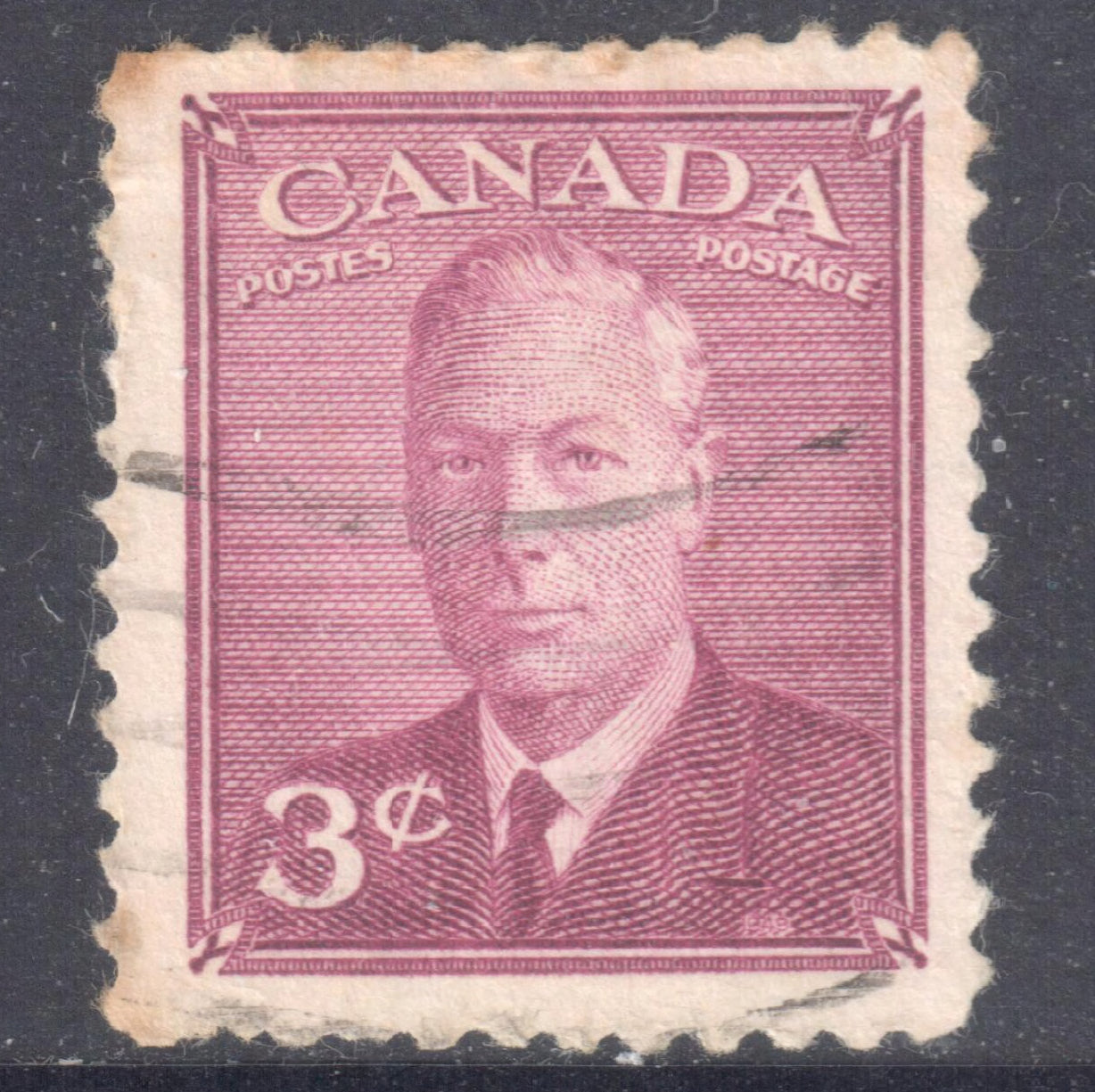 Canada 1949 - 1951 3 Cent Violet KGVI Stamp Perf:12. A used & postmarked stamp. Please view the images as all items are the actual images.