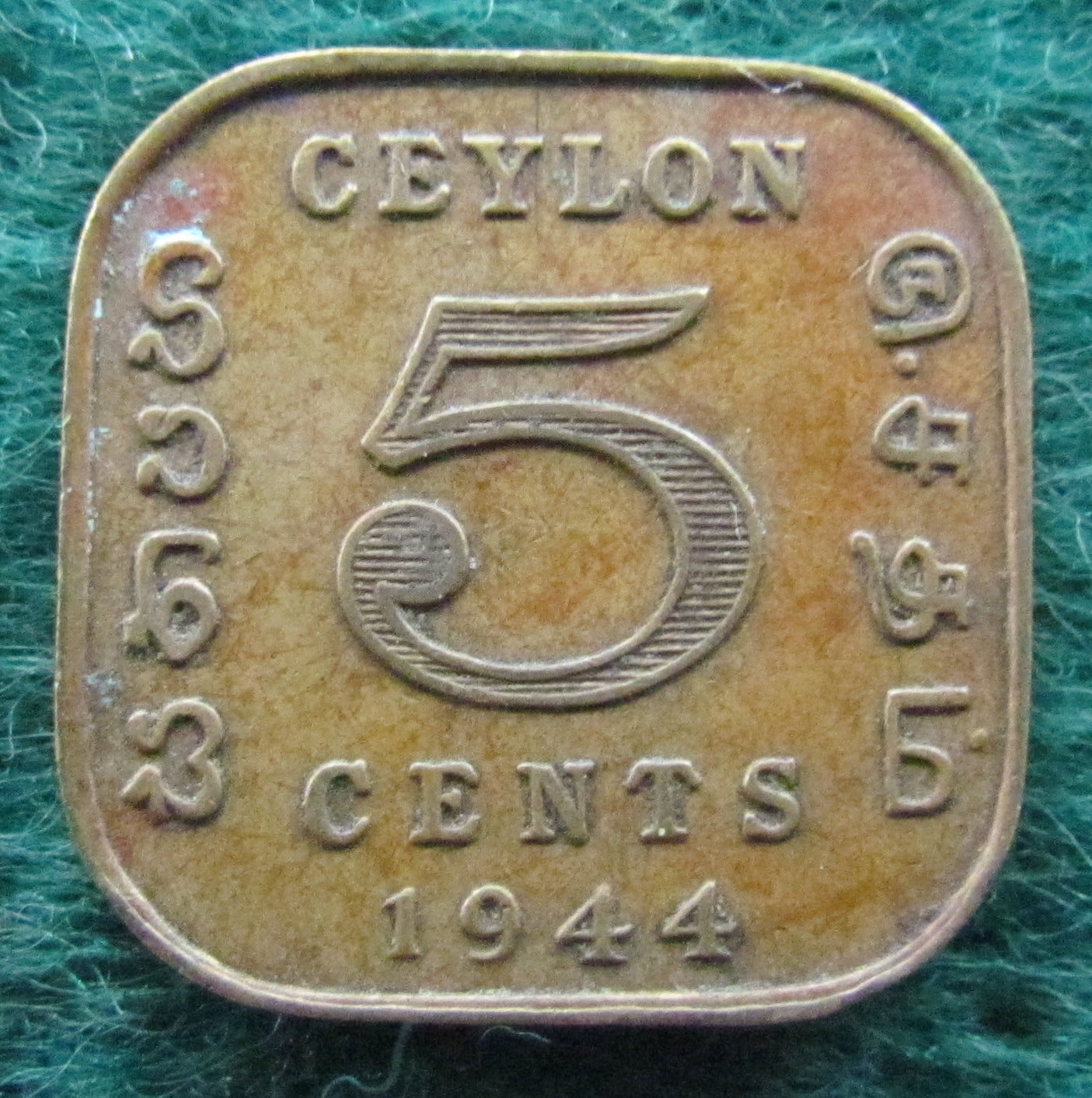 Ceylon 1944 5 Cent Coin - Circulated. A good coin showing wear and handling consistent with short to medium term circulation. Please view images as all images shown are of the actual item.